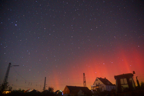 erst einmal allen Glückwunsch zu den tollen Sichtungen. Ich selbst war bereits gestern Abend gegen 23 Uhr raus, konnte dort aber aufgrund des Mondes und der städtischen Beleuchtung bisher nichts ausmachen. Erst kurz nach 0:45 konnte ich erstes rotes Glimmen am Nordhorizont fotografisch festhalten. Doch was dann gegen 1 Uhr passierte, hatte ich nicht mit gerechnet. Der Nordhimmel wurde plötzlich glutrot! Zu dem war auch noch ein grüner Bogen visuell sichtbar. Auf der Kamera zeigten sich sehr helle Beamer: Das Polarlicht wurde dann so hell, dass das Bild dann überbelichtet war: Nach herunterschrauben der Belichtung wurde dann eine knallrote Fläche mit darunter liegendem grünen Bogen sichtbar: Auch mit bloßem Auge war der Himmel nach wie vor rot. Das Polarlicht schwächte sich kurz nach 1 Uhr aber bereits wieder ab und konnte ab da an nur noch horizontnahes rotes Glimmen und einen grünen Bogen fotografisch festhalten. Dies änderte sich dann mit Beginn des zweiten Substurmes gegen 4 Uhr MESZ. Hier gab es dann deutlich visuelles Polarlicht mit grünem Bogen und roten Beamern, die Farben konnte ich ebenfalls wieder wahrnehmen: Später zeigte sich zu dem noch ein riesiger blauer Beamer: Dieser stieg gewaltig in den Himmel empor und lag sogar noch höher als der Polarstern, der zu dem Zeitpunkt etwa 51° über dem Horizont stand. Gegen 4:40 Uhr brach ich dann ab, zumal die städtische Beleuchtung wieder angeschaltet war und es auch zunehmend diesig wurde.