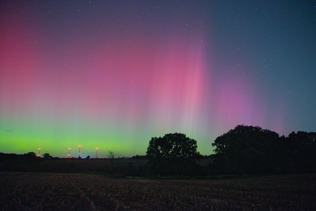 ich konnte das Polarlicht in Vechta aufnehmen. Für mich das beste Polarlicht seit dem Sonnenflecken Maximum Anfang der 2000er Jahre, das ich gesehen habe. Ich hatte abends die Ankunft der Schockfront mitbekommen und habe dann ab ca. 22:30 Uhr im Vechtaer Moor beobachtet. Es war zunächst grünes Polarlicht fotografisch nachweisbar und es gab auch einmal kurz einen roten Strahl. Dann ging der Mond langsam unter und der grüne Bogen war immer besser nachweisbar. Für ca. 1 Stunde gab es nur diesen grünen Bogen mit etwas diffusem Rot darüber, ohne irgendwelche rote Strahlen. Nahezu statisch. Ich war schon kurz davor abzubrechen, als dann gegen 1 Uhr die eigentliche Show losging. Visuell war eine Vielzahl weisser Beamer über dem grünen Bogen zu sehen. Es wurde dann immer intensiver und man sah dann auch visuell rote Flächen.