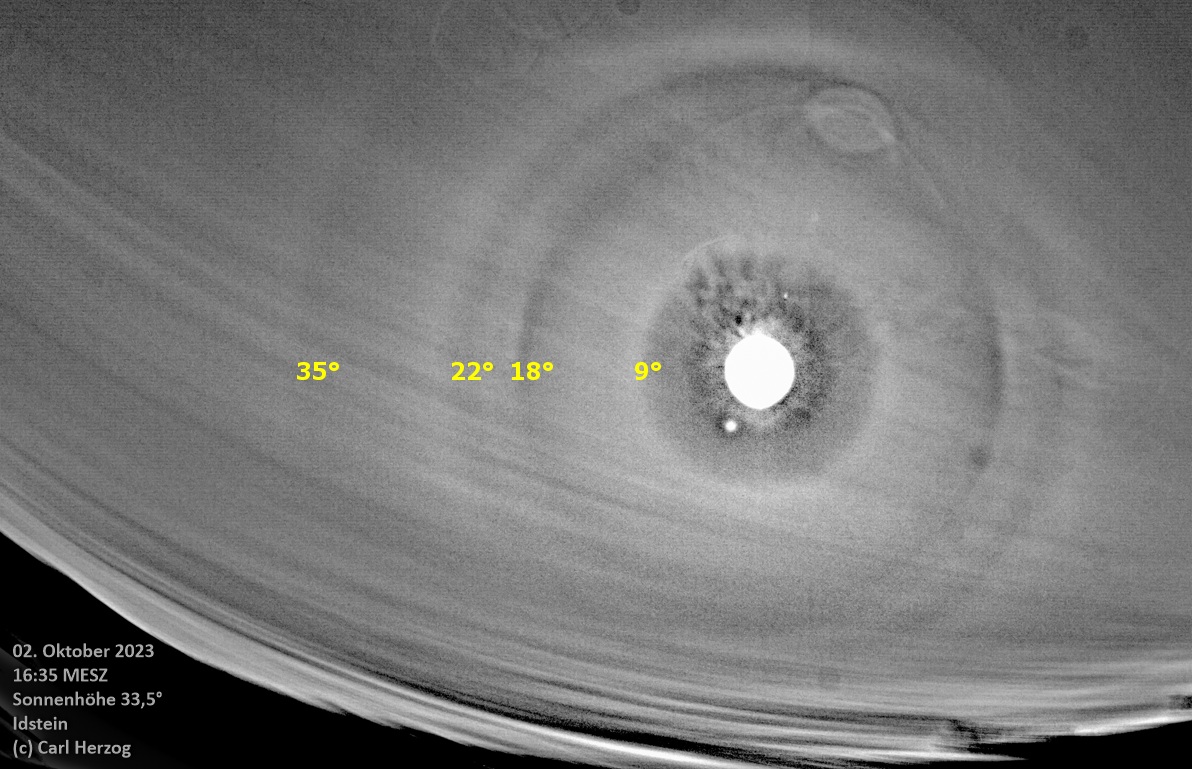 Beim ersten Bild scheint mir direkt anschließend an den 18er Ring noch ein Ring eingeschoben zu sein, für den 22°Halo sitzt der vermutlich zu nahe am 18°Ring.