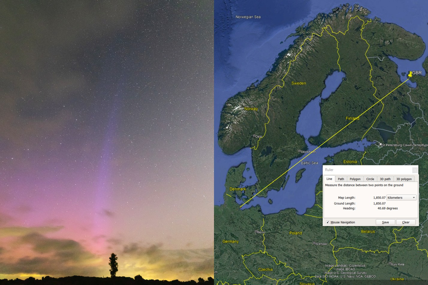 Regarding your hight estimation: you assume the auroral rays to be straight lines perpendicular to the Earth's surface. Using that precondition and my analysis that the most prominent GBR was located at approximately 65.65°N and 13.8°E, I arrive at a maximum altitude of the ray of roughly 4200 km for an elevation of 45° and 22800 km for an elevation of 65°. This is close to what you got.