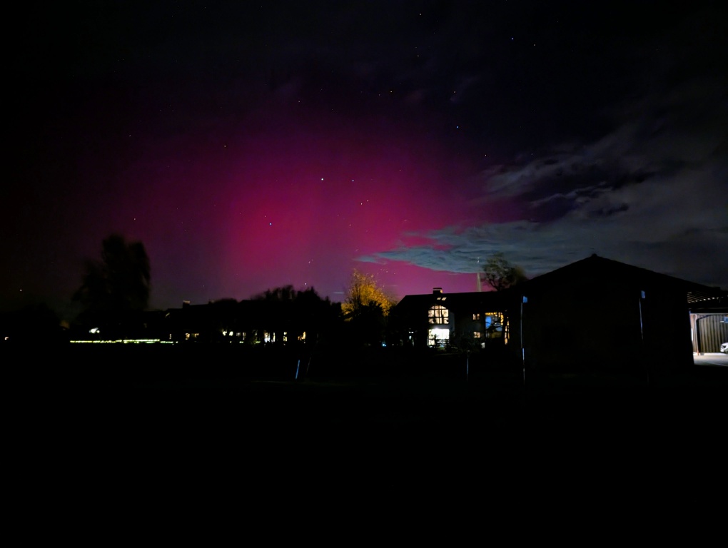 Anbei auch meine (eventuell von heute erste) Sichtung. Wie oben ersichtlich, hatte ich die Aufnahmen deutlich weiter südlich gemacht, da es bei mir Zuhause einfach nicht auflockern wollte. Aber auch bei dem Standort zogen einige Wolkenfelder durch und behinderten besonders nach Norden noch oft die Sicht (vielleicht hätte ich doch noch weiter nach Süden gemusst). Bei den ersten Aufnahmen fiel mir sofort ein roter Bogen auf, der fast bis zum Zenit reichte und besonders im Nordwesten eine ordentliche Helligkeit aufwies. Mit kam gleich der Verdacht eines SAR-Bogens. Der war übrigens nicht nur rot, sondern auch weiß! Das Weiß konnte ich sogar schwach visuell erkennen. Gegen 20:45 Uhr UTC ging dann die Aktivität deutlich nach oben und im Norden zeigte sich dann schönes rotes Polarlicht. Von der Helligkeit trotz der Wolken deutlich visuell, die rote Farbe konnte ich ohne Probleme erkennen. Teilweise zeigten sich auch sehr schöne Strahlen. Hier ein paar Bilder: Bilder übrigens alle mit einer Canon EOS R8 mit 24 bis 50mm.
