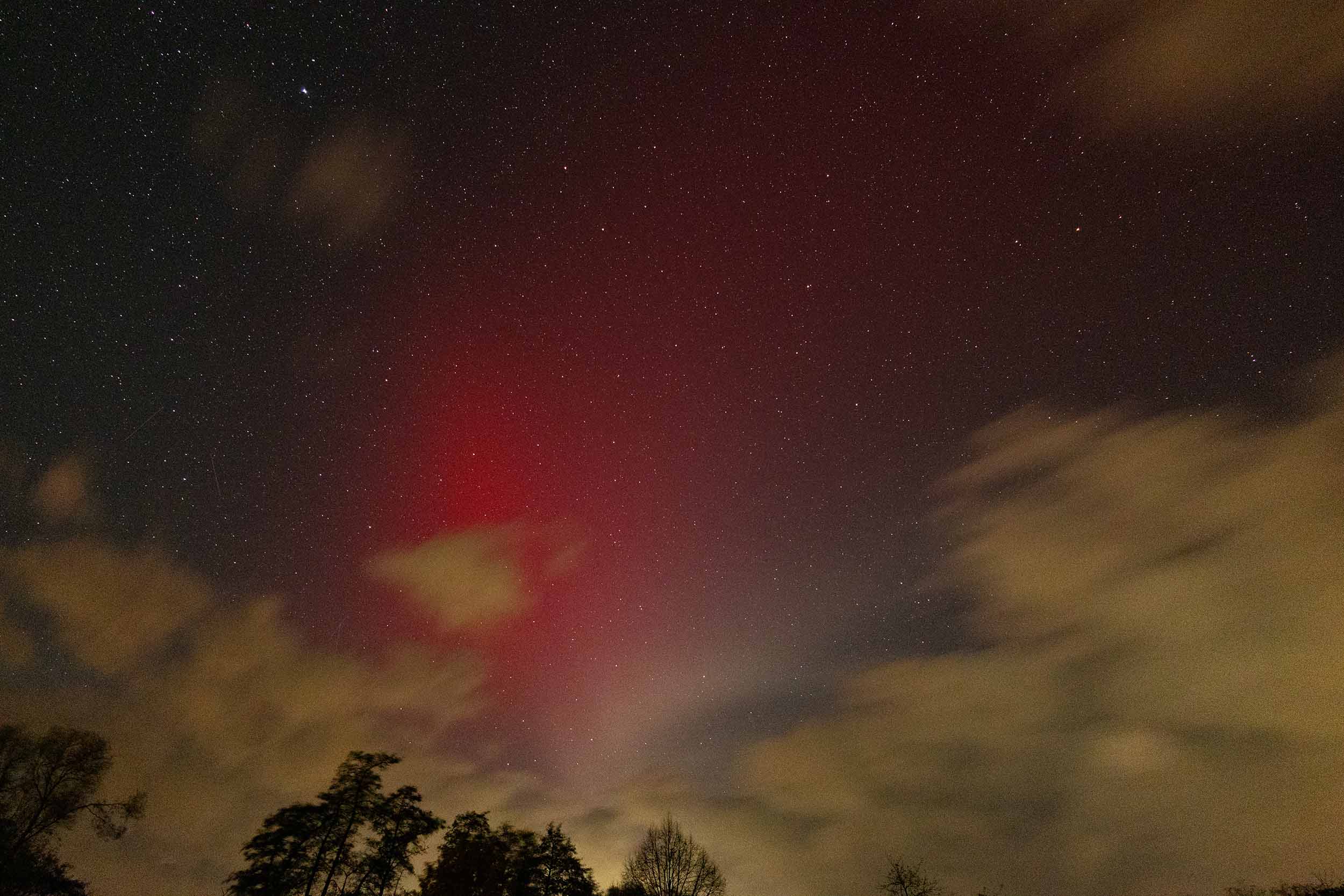 Anbei auch meine (eventuell von heute erste) Sichtung. Wie oben ersichtlich, hatte ich die Aufnahmen deutlich weiter südlich gemacht, da es bei mir Zuhause einfach nicht auflockern wollte. Aber auch bei dem Standort zogen einige Wolkenfelder durch und behinderten besonders nach Norden noch oft die Sicht (vielleicht hätte ich doch noch weiter nach Süden gemusst). Bei den ersten Aufnahmen fiel mir sofort ein roter Bogen auf, der fast bis zum Zenit reichte und besonders im Nordwesten eine ordentliche Helligkeit aufwies. Mit kam gleich der Verdacht eines SAR-Bogens. Der war übrigens nicht nur rot, sondern auch weiß! Das Weiß konnte ich sogar schwach visuell erkennen. Gegen 20:45 Uhr UTC ging dann die Aktivität deutlich nach oben und im Norden zeigte sich dann schönes rotes Polarlicht. Von der Helligkeit trotz der Wolken deutlich visuell, die rote Farbe konnte ich ohne Probleme erkennen. Teilweise zeigten sich auch sehr schöne Strahlen. Hier ein paar Bilder: Bilder übrigens alle mit einer Canon EOS R8 mit 24 bis 50mm.