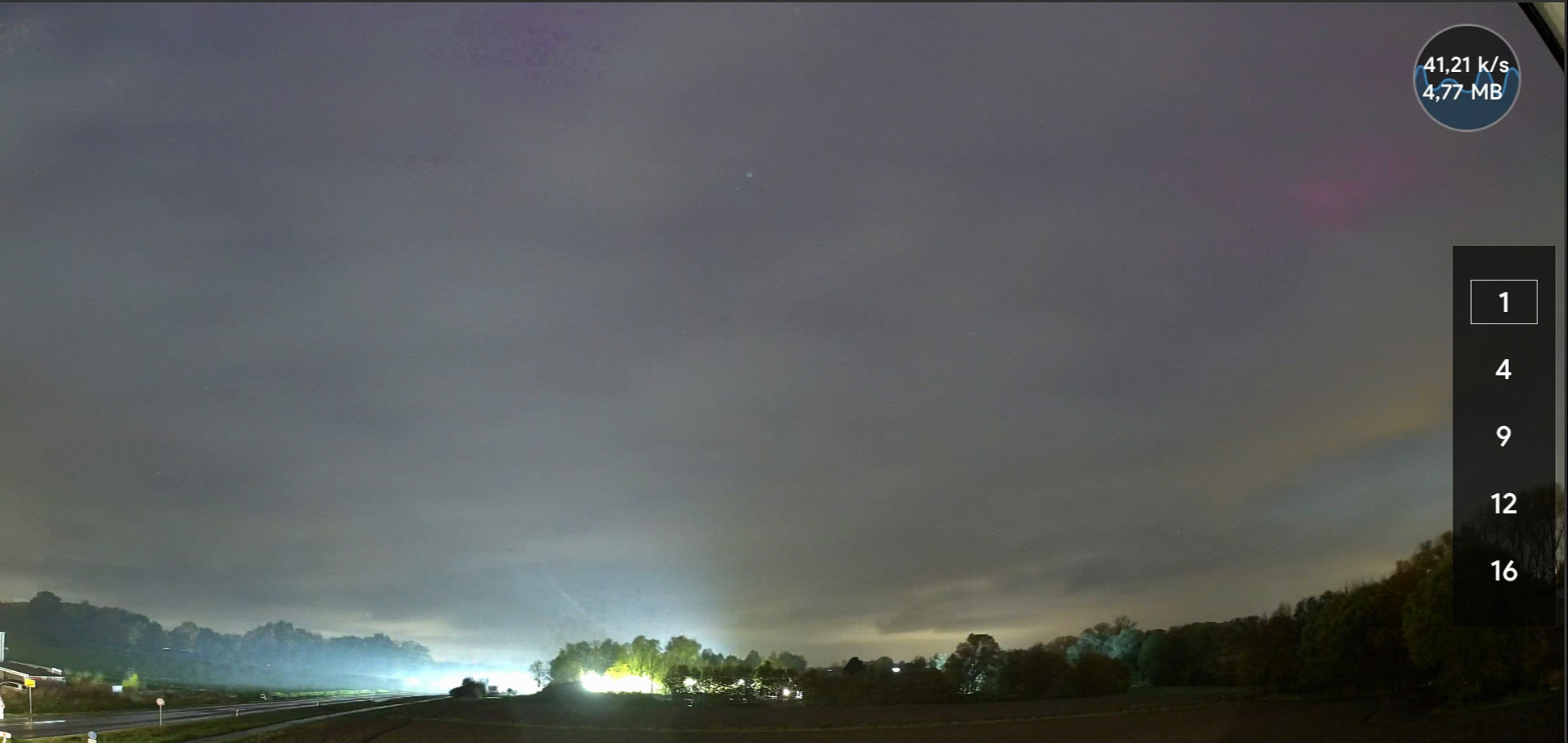 Ich konnte die Aufhellung vom Polarlicht in der Wolkenlücke gut mit dem bloßen Auge erkennen daher würde ich es als mindestens deutlich visuell einschätzen. Um 18:50 Uhr zog ein Regenschauer auf und ich rettete mich ins Auto. Danach versuchte ich um kurz nach 19 Uhr nochmal mein Glück, aber es war nichts mehr auf der Kamera zu sehen. Daher brach ich meine Beobachtung gegen 19:30 Uhr wieder ab.