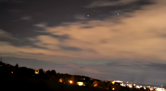 Wenig später zeigte sich nach Norden hin eine Wolkenlücke, in dem das Polarlicht leicht hindurchschimmerte.
