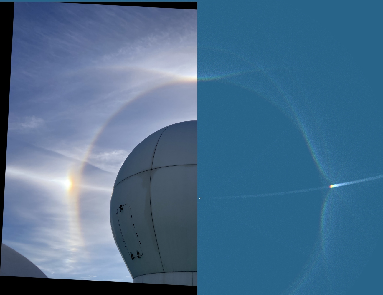 Auf der linken Seite (also im Originalbild) ist der Bogen, der unterhalb der Nebensonne sich nach Außen wegdreht, der untere Lowitzbogen. In der Simulation rechts sieht man, dass darüber sein Bauch leicht innerhalb des 22°-Ringes reingeht. Das ist im Originalbild als rötlichere Intensivierung des 22°-Ringes zu erkennen. Oberhalb der Nebensonne das gleiche (nur schwächer) aufgrund des oberen Lowitzbogens, der auch den 22°-Ring an einer Stelle berührt.