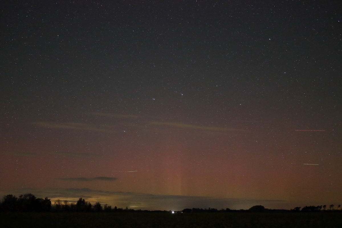 Nachdem ich gestern nur einen grünen und roten Schimmer in den Wolken sehen konnte, gab es heute immerhin ein paar schwache rote Beamer. Das Bild entstand 21:55 Uhr.