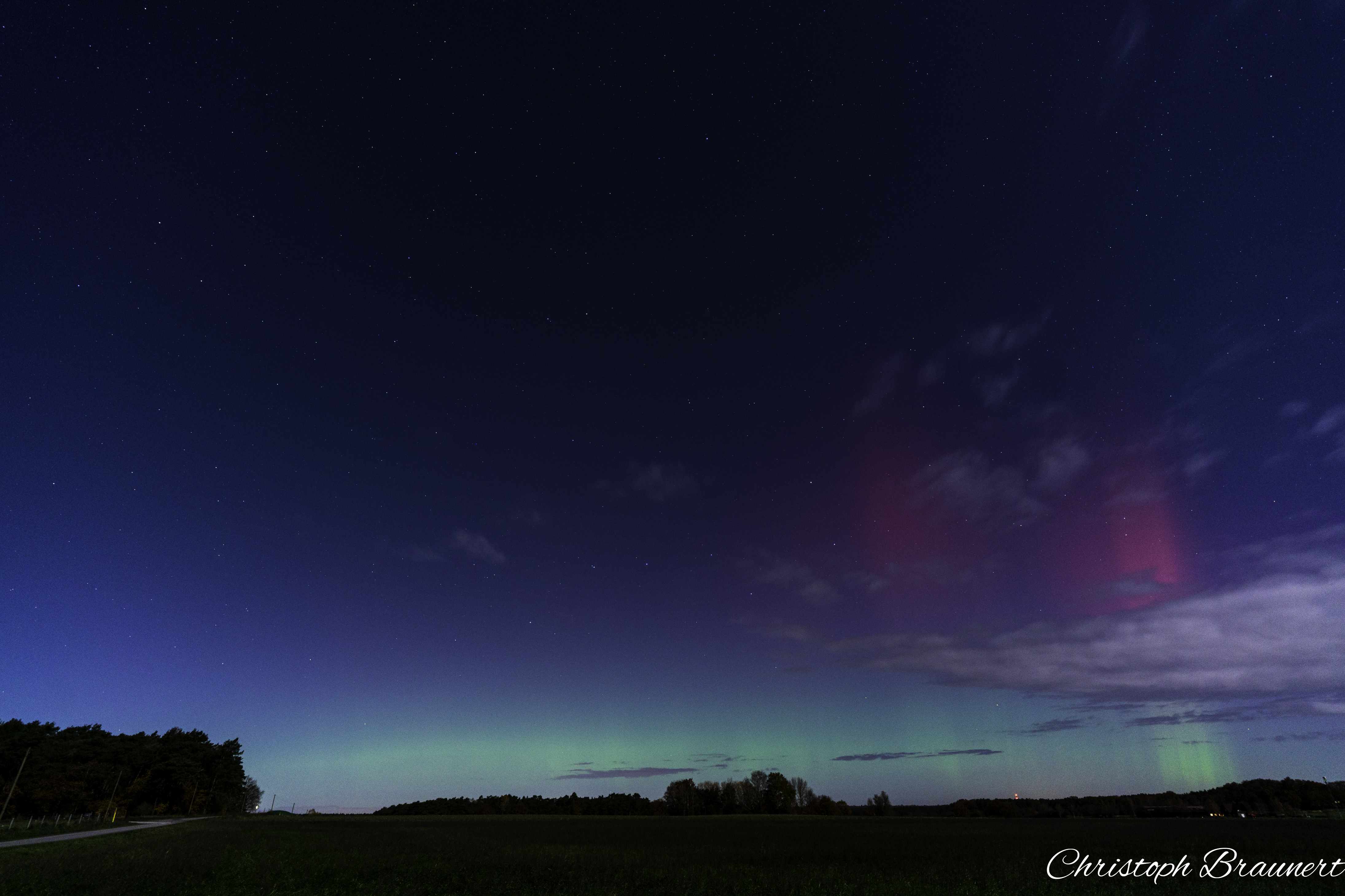 erst einmal Glückwunsch allen Erfolgreichen und zu den tollen Bildern. Ich selbst war auch erfolgreich, das Wetter spielte hier sehr gut mit. Erst am Ende zogen mehr Wolken aus Norden auf. Ich begab mich dieses Mal ins Feld westlich meines Heimatortes, wo in Richtung Norden bis auf WKAs kaum Lichtverschmutzung da und eine gute Sicht nach Norden gegeben ist. Schon von Beginn an konnte ich einen horizontnahen grünen Bogen festhalten. In diesem gab es auch schon mal ein paar Strahlen. Vorerst war alles nur fotografisch, das Mondlicht störte dabei sehr. Erst gegen 18:30 Uhr UTC begann dann deutlich visueller Substurm mit sehr schönen Strahlen in grün und rot: Wenig später gab es dann eine helle rote Fläche: Die Farben, insbesondere das Rot, waren mit bloßem Auge erkennbar. Nach dem ersten Substurm war dann nur noch der grüne Bogen vorhanden, bevor es wieder ein paar deutlich visuelle Strahlen rechts neben dem großen Wagen gab: Kurz nach 19:37 Uhr UTC begann dann ein nächster kurzer deutlich visueller Substurm mit wieder sehr schönen Strahlen: Ohne den Mond wäre das bestimmt ein durchaus helles Event gewesen. Aufgenommen übrigens mit 50mm, F1.8, ISO 2000 bis 2500 und 2 bis 2,5 sec
