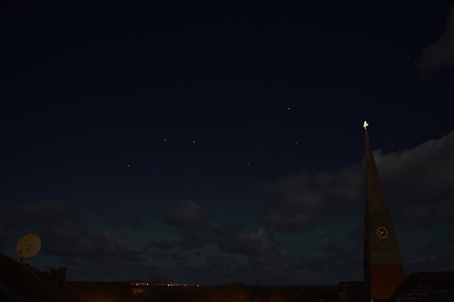 Während der erste Substorm bei Flensburg noch von Wolken verdeckt war, war der grüne Bogen nach dem Aufklaren sofort gut erkennbar. Der recht kurze 2. Substorm ab ca 20.35 Uhr MEZ dann deutlich bis teilweise hell sichtbar. Hier 3 Fotos davon.
