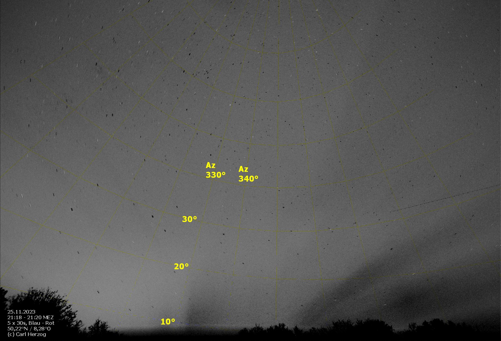 Das Summenbild geht von 21:18 bis 21:20 MEZ. Die ganz leicht eingeblendeten Gitterlinien sind exakt, von ASTAP per Platesolving eines Einzelbilds bestimmt. Im Bereich zwischen Azimut 330° und 340° gehen die Säulen bis 20° hoch, evtl. noch etwas mehr.