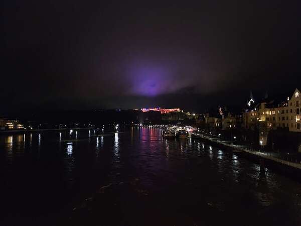 ich war heute zufällig auch abends etwas auf dem Hausberg unterwegs, um mir mal die beleuchtete Festung Ehrenbreitstein von meinem Ortsteil aus anzusehen. Da es dicht bewölkt war, waren leider die möglichen Polarlichter nicht der Grund für den kleinen Ausflug.