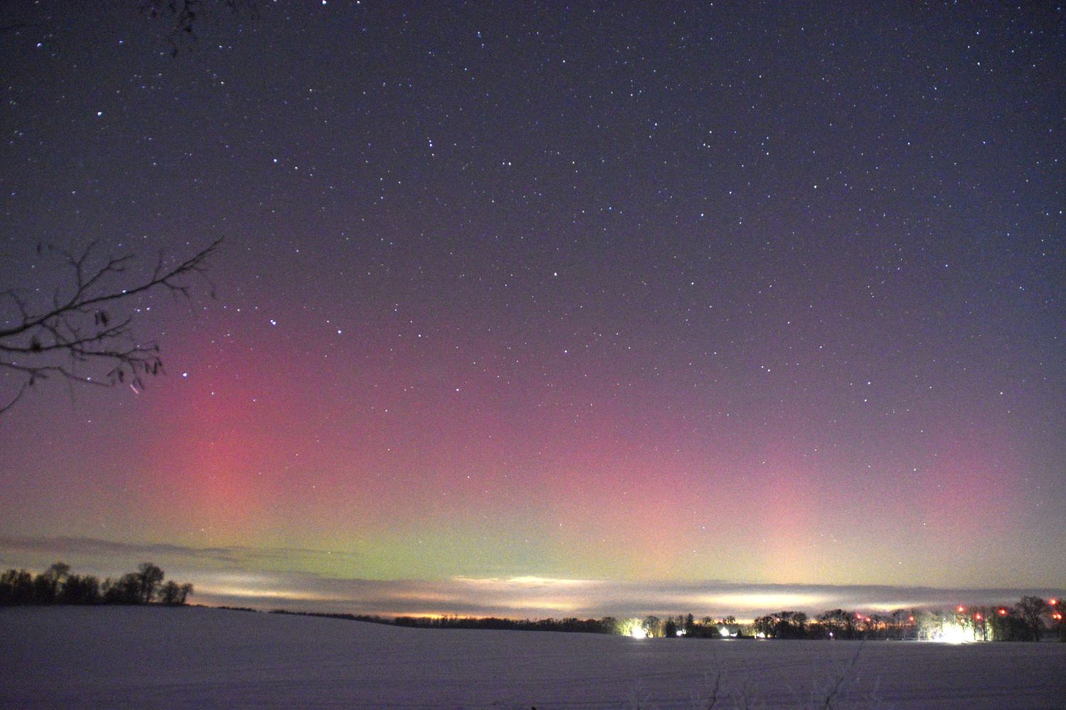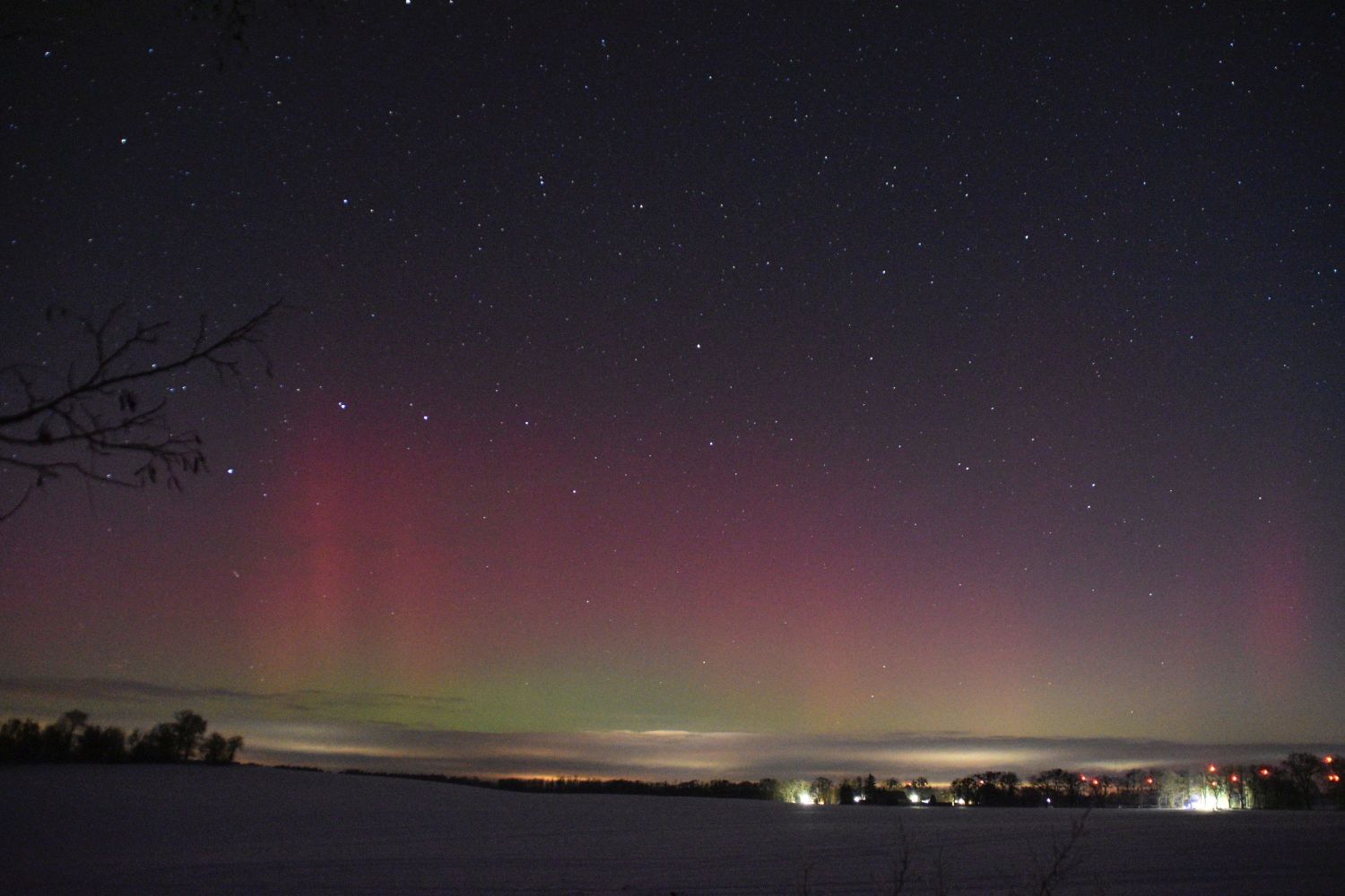 Erscheinungsbild: Überwiegend rotes Polarlicht über dem Nordhorizont, beginnend mit roten Strahlen (mit Bewegung von Ost nach West), zur Hauptaktivitätsphase des ersten Substorm mit roten Polarlichtstrahlen bis auf min. 25° Höhe., darunter zeitweise fotografische Grüntöne, an der Westflanke des Nordsektors zeitweise rotes (flächig-diffuses) "nachglühendes" Polarlicht.