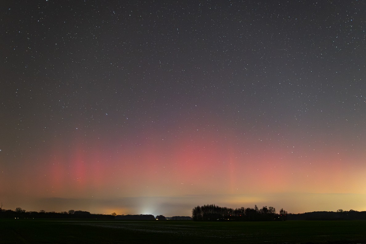 Erscheinungsbild: Überwiegend rotes Polarlicht über dem Nordhorizont, beginnend mit roten Strahlen (mit Bewegung von Ost nach West), zur Hauptaktivitätsphase des ersten Substorm mit roten Polarlichtstrahlen bis auf min. 25° Höhe., darunter zeitweise fotografische Grüntöne, an der Westflanke des Nordsektors zeitweise rotes (flächig-diffuses) "nachglühendes" Polarlicht.