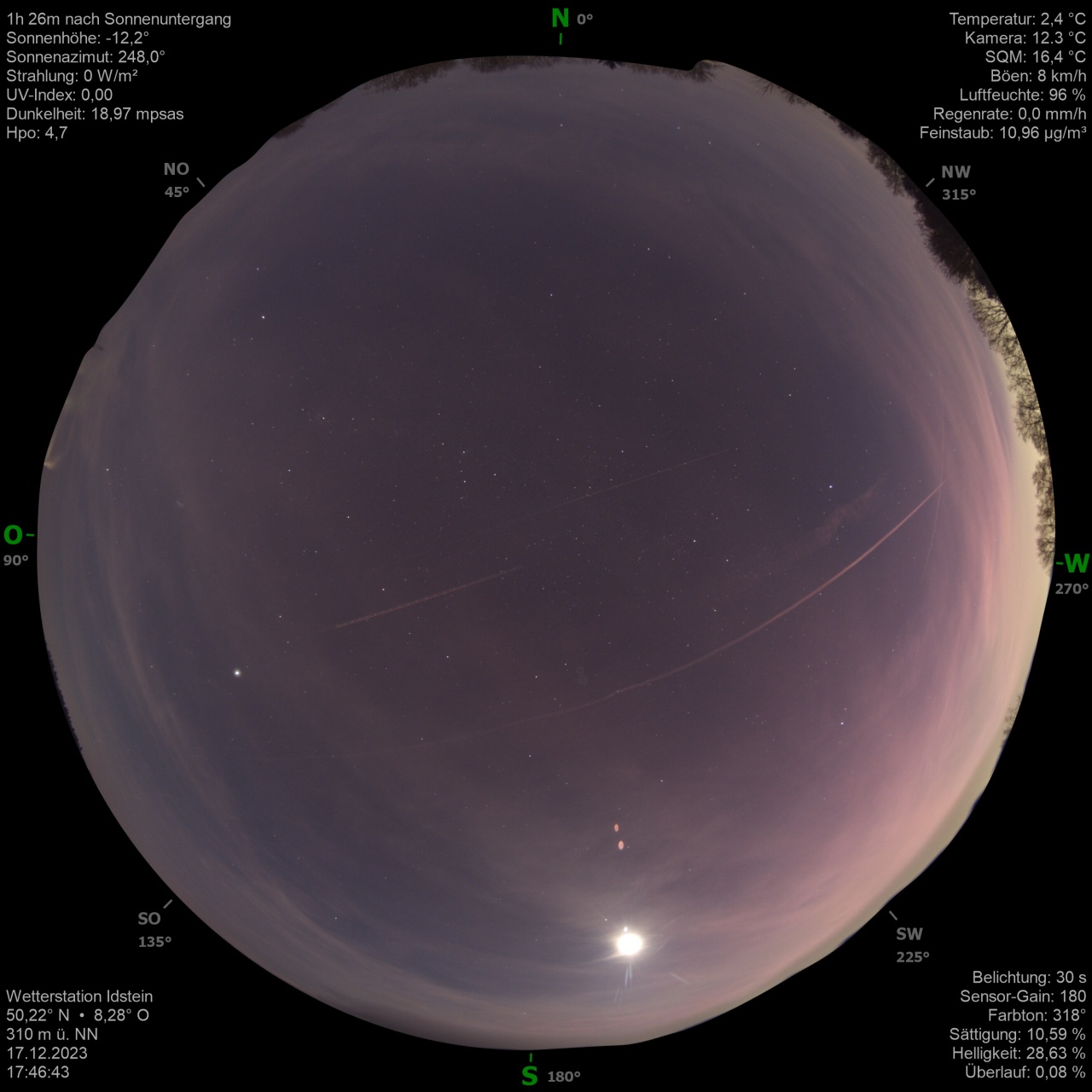 Das Sichtfeld beträgt 110x81°. Das Video geht von 18:05 bis 19:21 MEZ. Der gestrige Hp30-Wert erreichte - bezogen auf die Dunkelheitsstunden - gegen 18:10 bis 18:15 seinen Höhepunkt (er lag dabei bei 5+).