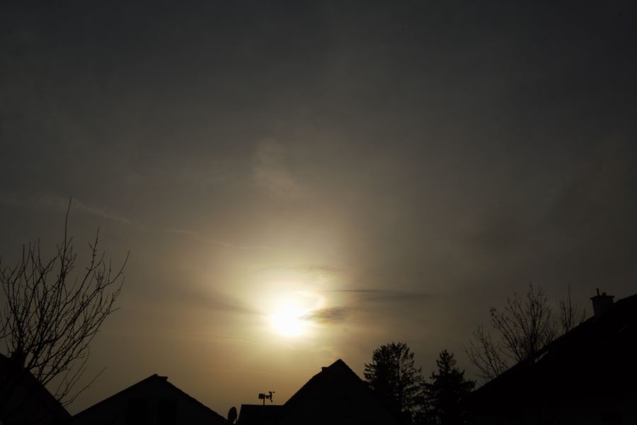 Die Sonne zeigte sich heute sehr gelblich trüb, überhaupt die ganze Stimmung trotz Wolken war so falb und merkwürdig. Früh Morgens zeigte sich auch ein Hauch von linker Nebensonne. Es ist mal wieder mit dieser südöstlichen Strömung und dem Italientief Saharastaub unterwegs.