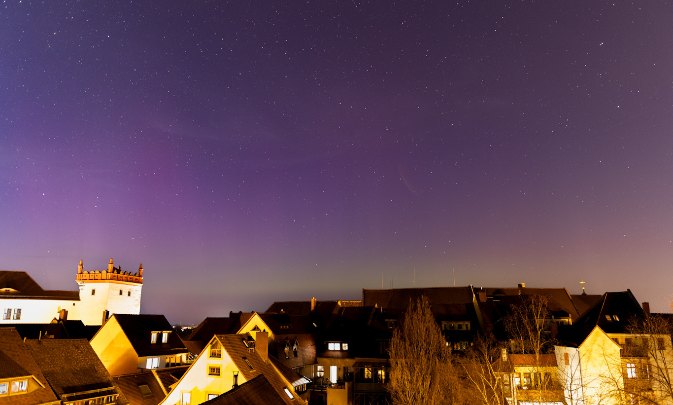 Die Strahlen waren schwach visuell erkennbar (trotz Lichtverschmutzung), man konnte sogar das Rot erahnen. Hier nochmal mit 50mm aufgenommen: