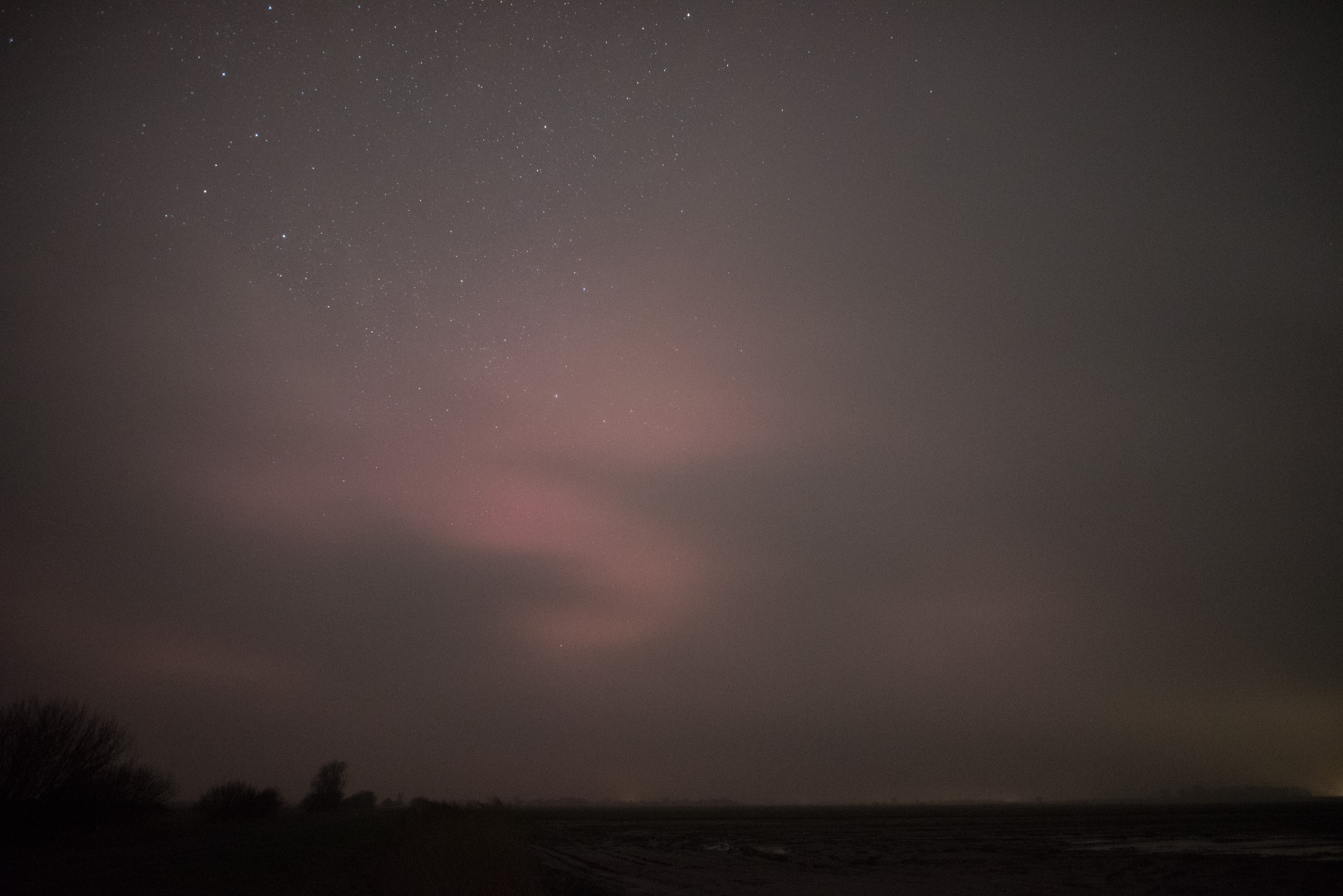 Ankunft am Beobachtungsort, ca. 19 Uhr: Von der Landstraße ging es auf einen geschotterten Feldweg, positioniert unweit der Straße. Die Nautische Dämmerung setzte ein, vereinzelte Zirruswolken zeichneten das Firmament und erste Himmelsobjekte des sich verabschiedenden Wintersternenhimmels wurden sichtbar. Die Durchsicht auf Himmel und Landschaft war eher dunstig, während es zunehmend kälter wurde und erstes Wild mit seinen Rufen die Nacht einläutete. Ein Blick zum Himmel über mir: Sternenklar. Schnell setzte ich die Kamera auf das Stativ, richtete sie auf den Nordhorizont und konnte direkt eine Grünfärbung feststellen, welche noch unter starkem Eindruck der Dämmerung stand. Ein Blick in den Nord-Westen: