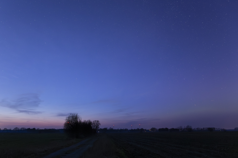 Als ich das gelesen habe musste ich schmunzeln. Ich war ebenfalls mit meinem 10-Zoll Newton unterwegs um den Kometen zu fotografieren. Aber Richtung Norden war der Himmel völlig dicht und ich konnte die Montierung gar nicht erst einnorden. Der Newton blieb also im Auto. Zum Glück hatte ich die kleine Canon mit Weitwinkel und Stativ dabei als es dann gegen 20:30 Uhr langsam aufklarte...