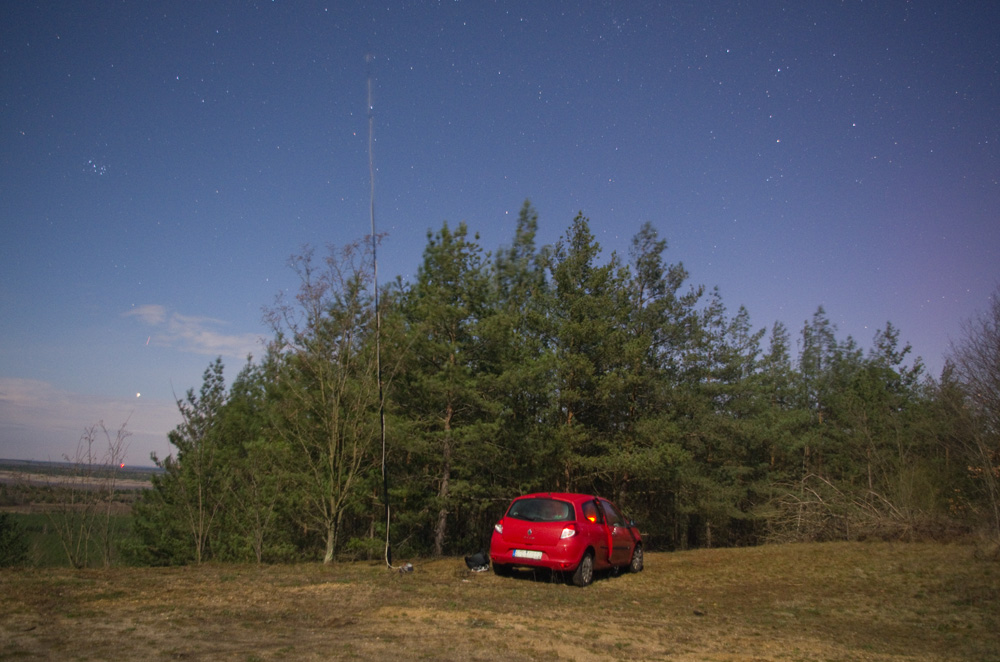ich war in dieser hellen Mondnacht auch draußen, aber für ein paar Funkaktivitäten, und mal wieder ohne vorher Polarlichtprognosen angeschaut zu haben (und ohne Internet für unterwegs). Zufällig ist wohl etwas vom Polarlicht als diffuser roter Schimmer auf eines meiner Fotos geraten (ganz am rechten Bildrand, d.h. Richtung Norden - erkennbar im Vergleich zum Himmel auf der linken, d.h. westlichen, Seite). Aufnahmezeit war 21:43 MEZ, Standort Kostebrau in der Niederlausitz.