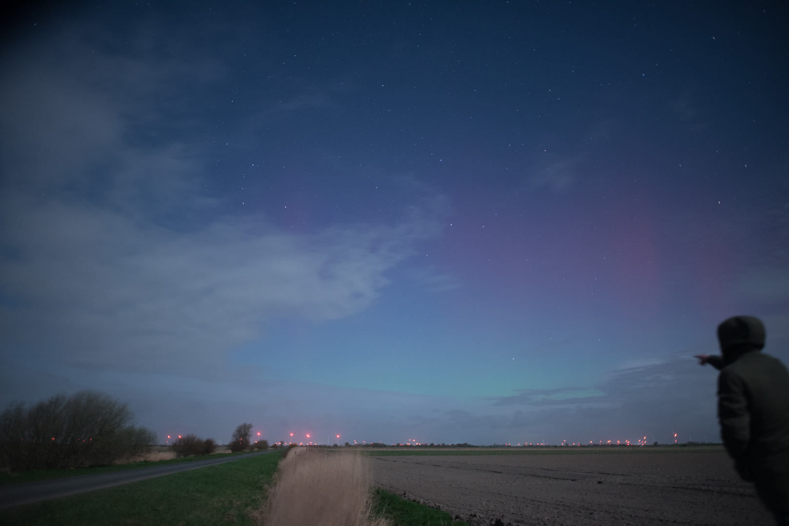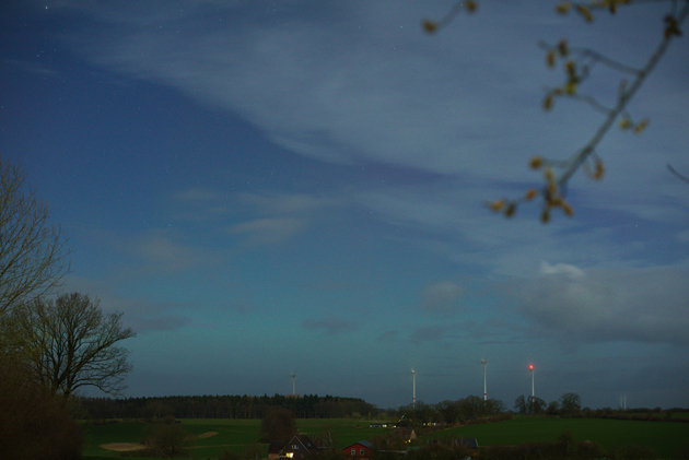 - Kommentar: Ich habe am Anfang der Beobachtungen bei schnell wechselnder Bewölkung zwischen Bad Oldesloe und Poggensee für ein paar Minuten das grünliche Polarlichtband wenige Grad über dem Horizont schwach visuell sichten können. Später war das Nordlicht nur noch fotografisch nachweißbar mit ein paar rötlichen Beamern, der Mond störte ziemlich stark....