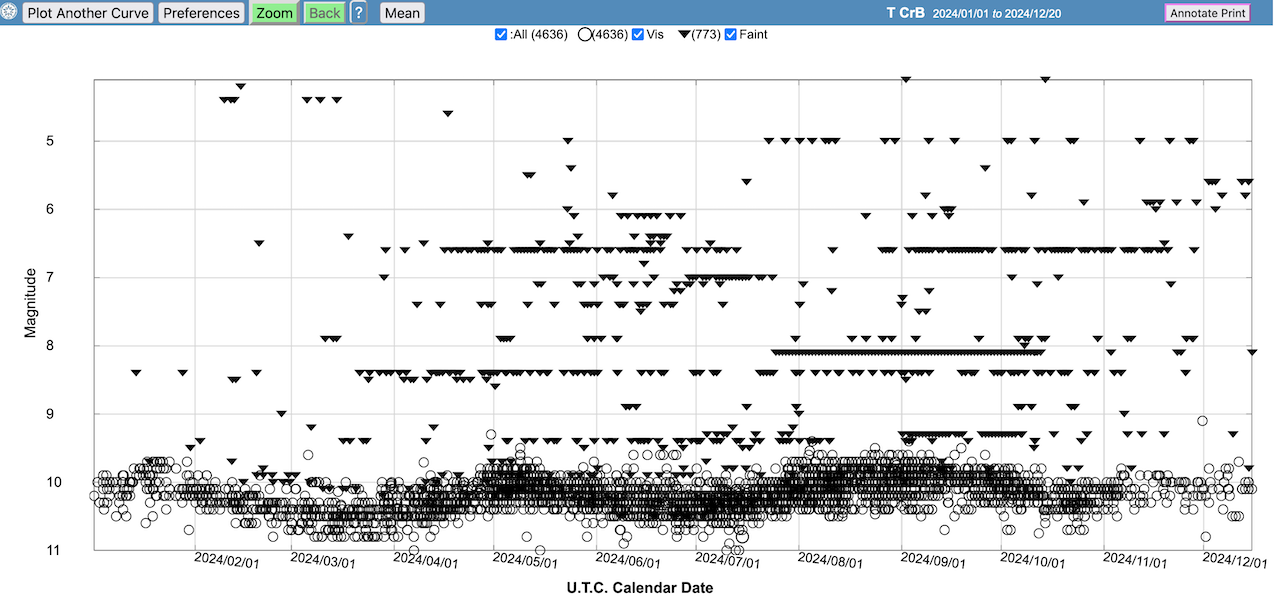 Für dieses Jahr wurden bisher knapp 82.800 (!) Beobachtungen von T CrB allein im V-Bereich an die AAVSO gemeldet. Vor diesem Hintergrund erscheinen Fehleingaben als extreme Ausnahme (sofern diese überhaupt noch händisch eingegeben werden). Und in der aktuellen Lichtkurve (in V) gibt es 5 Einträge >5 bzw. >6. Man kann die Sinnhaftigkeit solcher Meldungen hinterfragen (immerhin stammen alle von einem einzigen Beobachter, der als Vergleichstern stets 7.9 angibt; dann sollte es aber >7.9 heissen...). Visuell sind im gleichen Zeitraum über 4600 Schätzungen eingegangen, und zusätzlich über 770 im "schwächer als"-Bereich – und diese sind anfälliger für Fehleingaben. Das sieht dann so aus: Gruß aus HD,