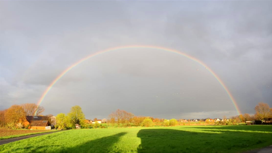 Heute Nachmittag (5. April) konnte ich während eines Schauers einen eigenartigen, flachen Regenbogen aufnehmen. Sah aus, als wären da zwei Regenbögen, nur mit geringem Abstand und der selben Farbreihenfolge: