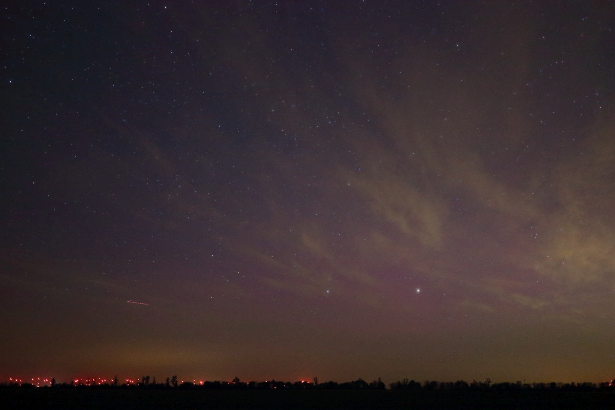 ich konnte trotz der schlechten Bedingungen durchaus etwas Polarlicht in dieser Nacht nachweisen. Der Nachweis war rein fotografisch, an visuell konnte man bei den Bedingungen hier gar nicht denken. In der ersten Nachthälfte waren sehr viele hohe Wolken unterwegs, ich konnte aber kurz vor dem Höhepunkt der Aktivität was in den Wolkenlücken nachweisen: Danach war dann erst einmal Schluss, denn es war komplett dicht. Erst in der zweiten Nachthälfte ergaben sich wieder bessere Gelegenheiten, da sich das Gewölk nach Norden verabschiedete, aber nicht ganz verschwand. Der Saharastaub und auch Dunst aufgrund hoher Luftfeuchte gaben noch den Rest dazu.