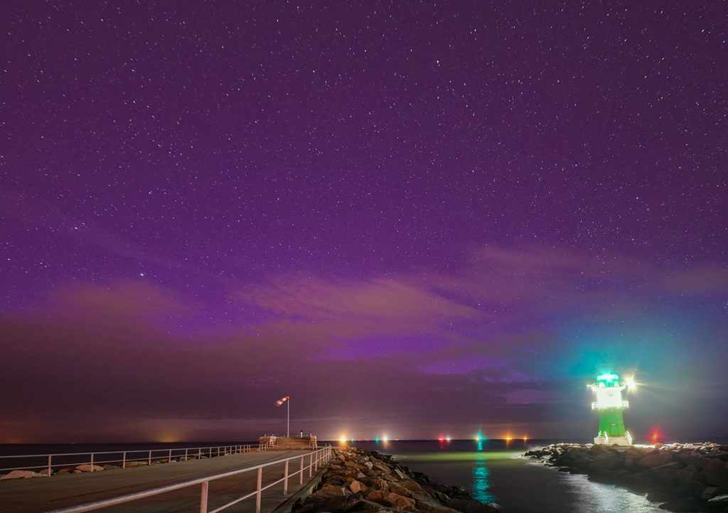Am Abend war hier zunächst nichts zu sehen. In der Nacht, als ich zufällig wach war, habe ich gegen 02:15 MESZ eher "sicherheitshalber" mal auf den Auslöser gedrückt. Bis etwa 03:25 MESZ habe ich beobachtet und es war durchgängig (violettes und kurzzeitig rotviolettes) Polarlicht fotografisch nachweisbar. Bis etwa 03:15 MESZ sind fast durchgängig auch Beamer aufgetreten. Danach wurde das PL schwächer, während die Tageshelligkeit recht schnell zunahm.