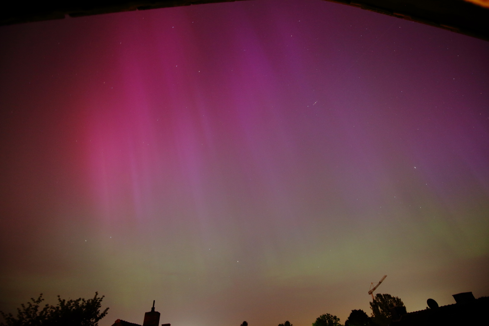 Trotz der Lichtverschmutzung in der Stadt konnte ich von ca. 22:15 bis 22:35 Uhr deutlich visuell ein Polarlicht erkennen. Aber auch noch mehrere Stunden später war mit der Kamera immernoch etwas rot bis violett/grün zu erkennen.