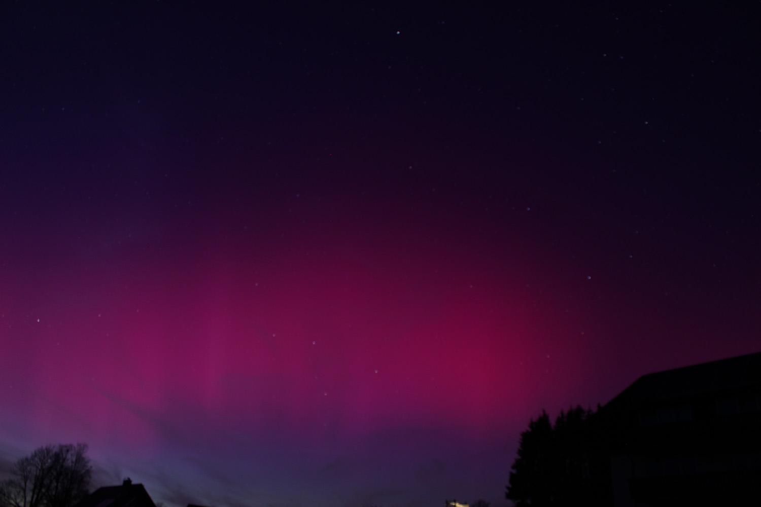 wir konnten schon gegen 22:10 die ersten rosa Schimmer zwischen den Wolken erkennen, bereits diese waren deutlich visuell aber tiefer rötlich. bis in die Nacht war es einfach nur super. Hier ein paar Bilder. Ort: Bei Waldsassen / Nordbayern an der Gernze zu Tschechien