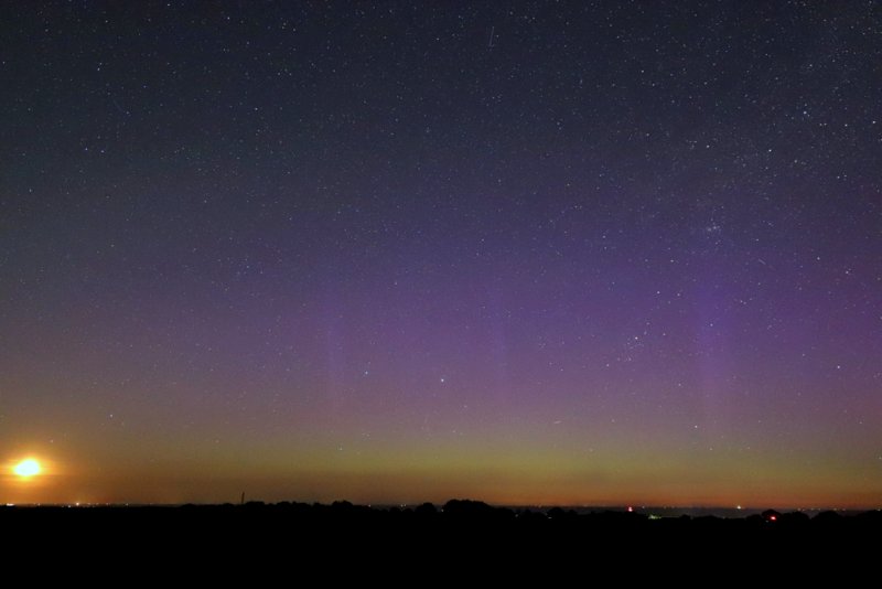 Da die Werte am DSCOVR bzw. ACE sich nochmal freundlich entwickelten, bin ich kurzentschlossen rausgefahren. Gleich zu Beginn war fotografisches rotviolettes Polarlicht bis zum Ende der Beobachtung nachweisbar. Ebenso sind Strahlen schemenhaft im Zeitraffer fotografisch nachweisbar. Lediglich für wenige Minuten wurden einzelne Strahlen schwach visuell.