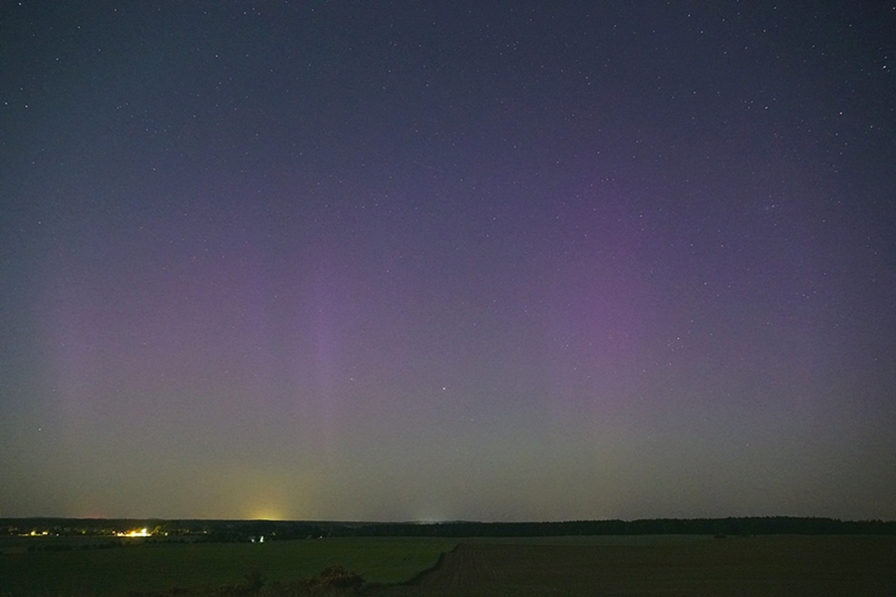 Von zu Hause in Barnin aus zeigten sich kurz vor Mitternacht auf dem Kameradisplay erste rotviolette Flächen, so dass ich dann noch nach Hof Barnin gefahren bin. Kurz nach 01:00 MESZ nahm das violette Leuchten über einem etwas stärker werdenden grünlichen Bogen zu und von ca. 01:10 bis kurz nach 02:00 Uhr MESZ zeigten sich wandernde Beamer in wechselnder Helligkeit, überwiegend fotografisch, aber auch immer wieder einzelne hellgraue Strahlen schwach visuell. Mit dem Verblassen bin ich wieder nach Hause gefahren. Vorn dort aus war weiterhin violettes flächiges Leuchten auf der Kamera sichtbar, bis ich gegen 02:45 die Beobachtung abgebrochen habe.