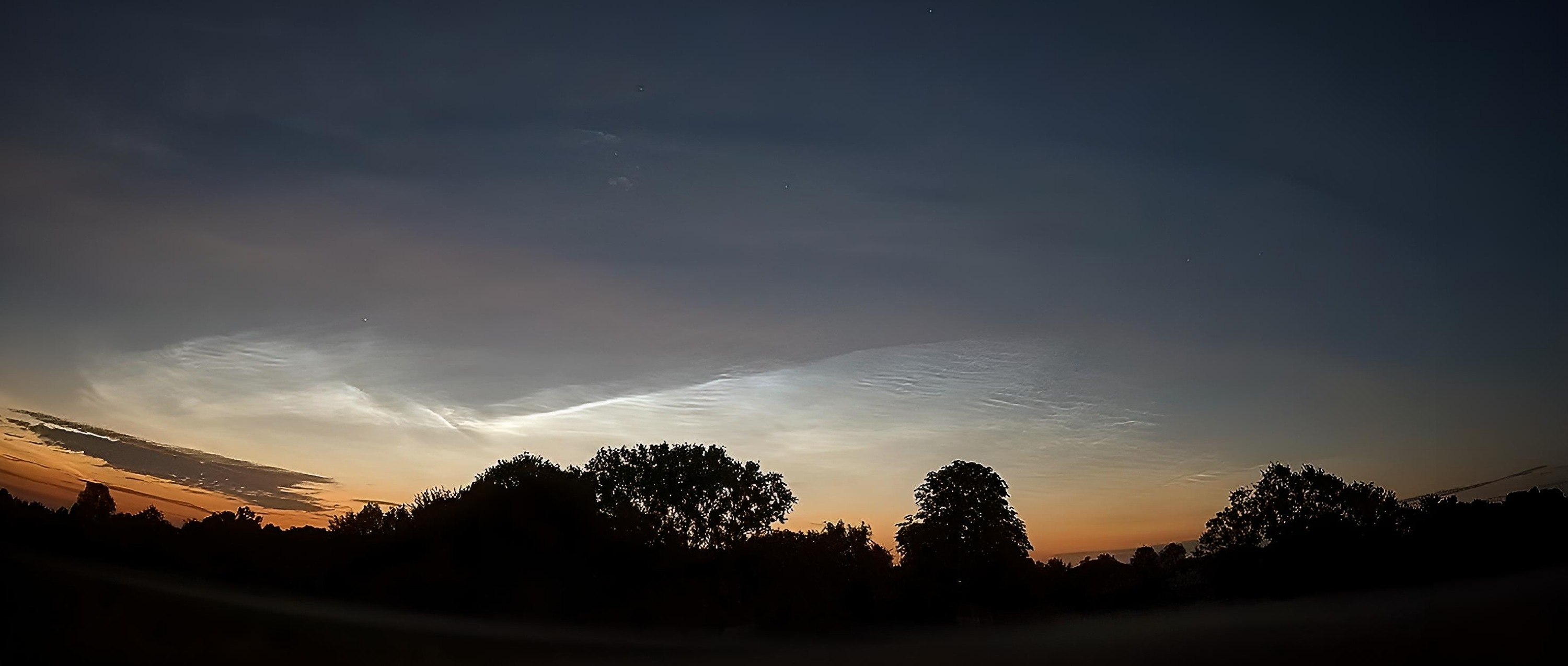 (das habe ich so noch nie gesehen!) ist der Farbunterschied zwischen dem von Berlin aus gesehen linken, in den Formen eher "weichen" NLC Feld ungefähr im N, welches sich eher gelblich präsentiert, zum rechts daneben schwebenden "scharfkantigen" NLC Feld im NNO, welches visuell deutlich Blau erscheint. Das ist kein Farbgradient durch verschiedenen Winkel zur Sonne. Scheint eher was mit einer grundsätzlichen Verschiedenenartigkeit (Kristallstruktur? Ausrichtung? Höhe?) der Felder zu tun zu haben.