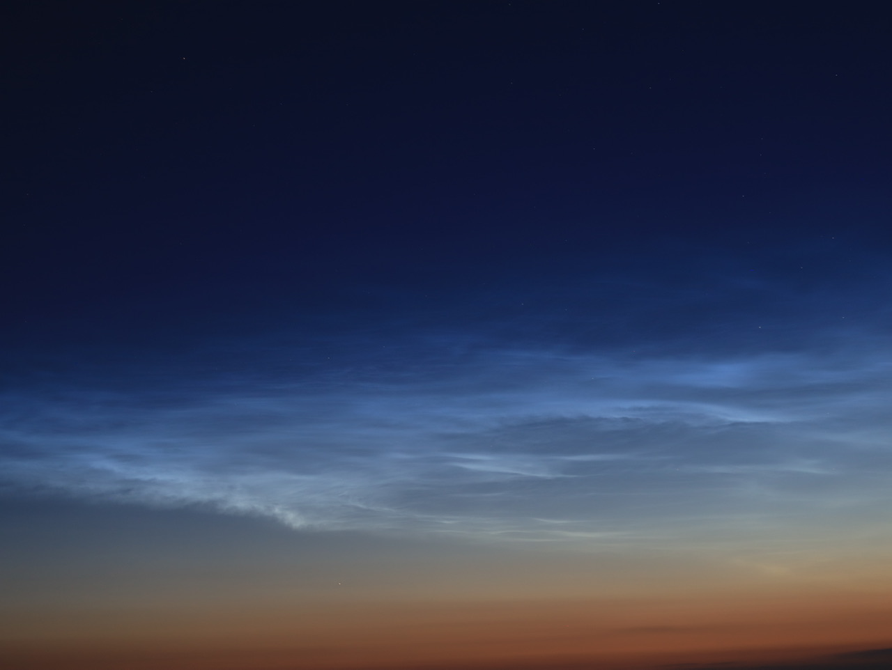 (das habe ich so noch nie gesehen!) ist der Farbunterschied zwischen dem von Berlin aus gesehen linken, in den Formen eher "weichen" NLC Feld ungefähr im N, welches sich eher gelblich präsentiert, zum rechts daneben schwebenden "scharfkantigen" NLC Feld im NNO, welches visuell deutlich Blau erscheint. Das ist kein Farbgradient durch verschiedenen Winkel zur Sonne. Scheint eher was mit einer grundsätzlichen Verschiedenenartigkeit (Kristallstruktur? Ausrichtung? Höhe?) der Felder zu tun zu haben.