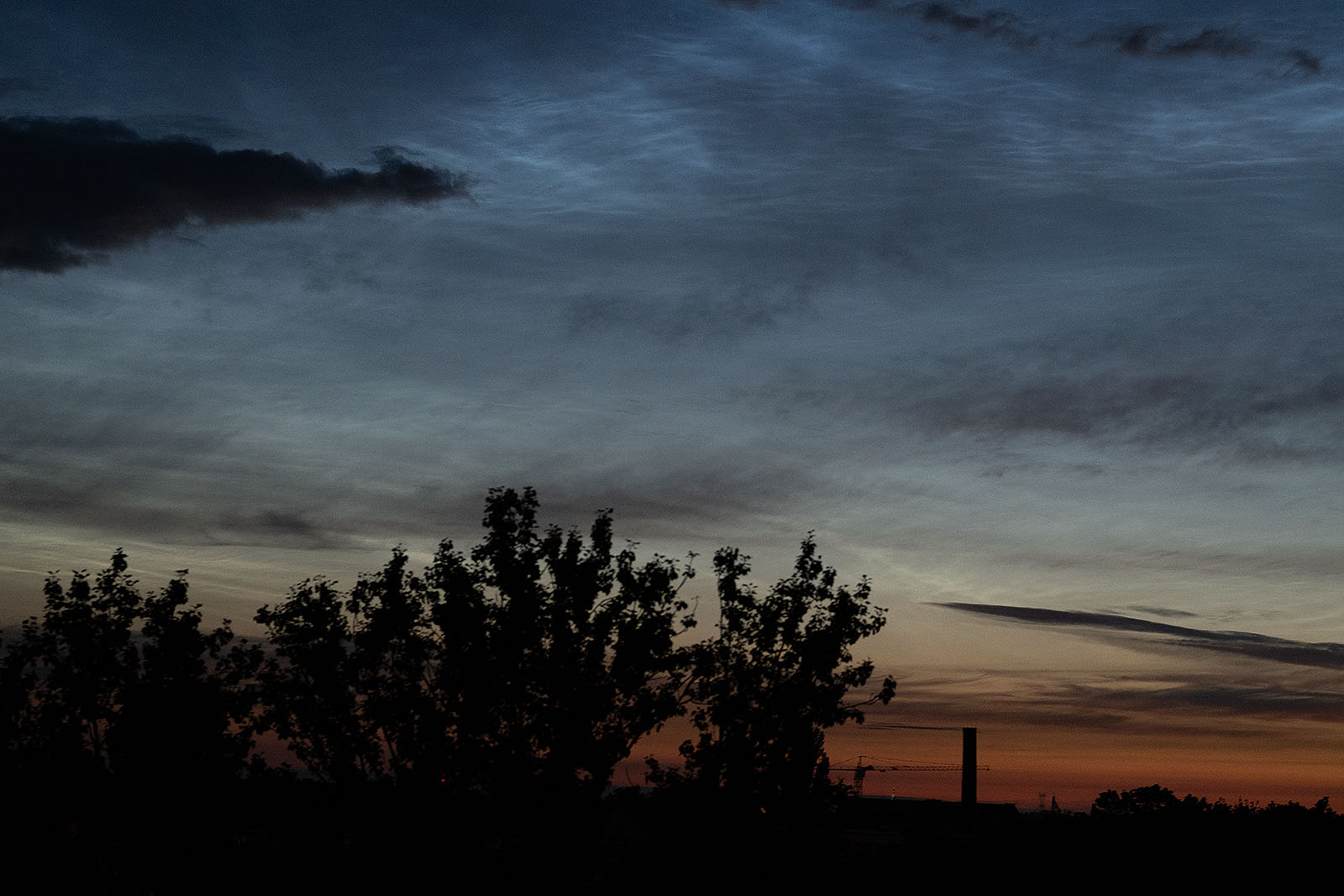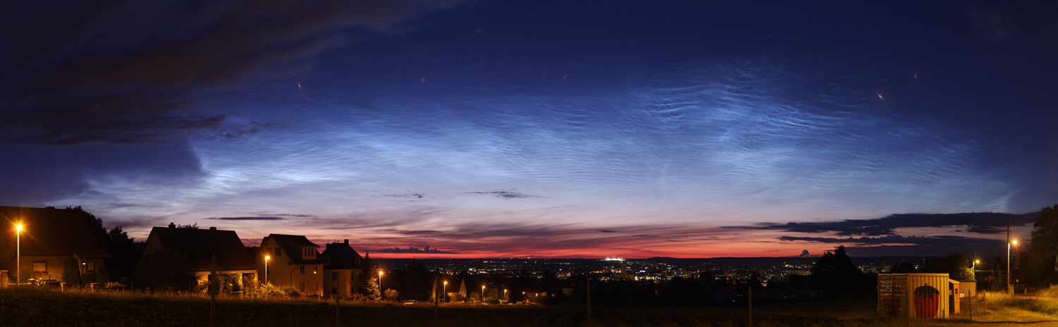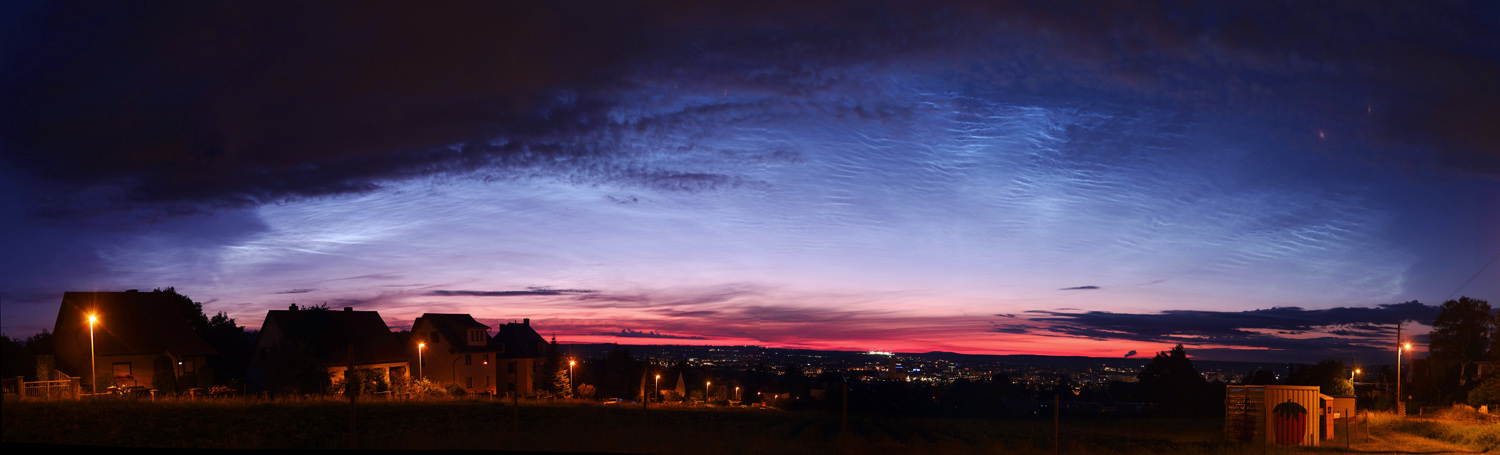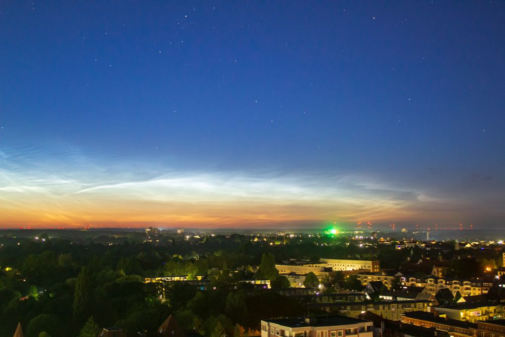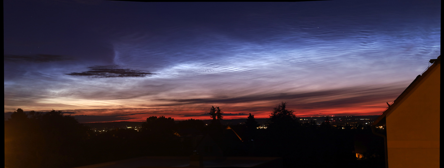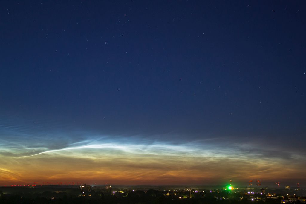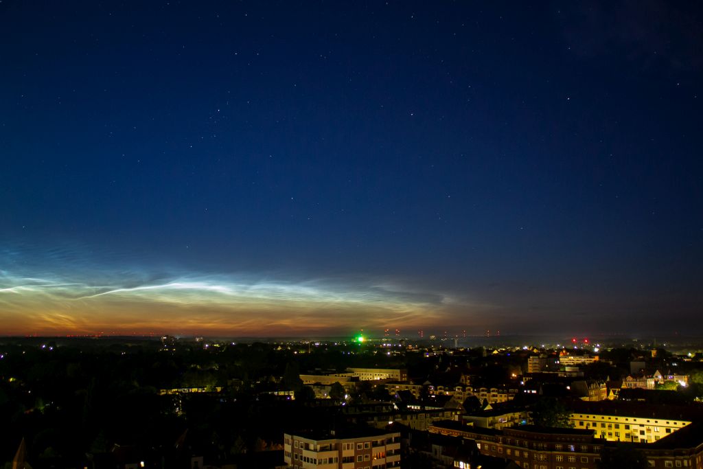 In der Berliner Innenstadt zeigten sich kurz vor 22:30Uhr MESZ NLC-"Rippen" in Wolkenlücken gen NNO, hochstehend. Bei einem Sonnenstand erst um die -6° sowie Zirren und anderem Gewölk schon erkennbar, da dürften diese NLC recht ausgeprägt sein.