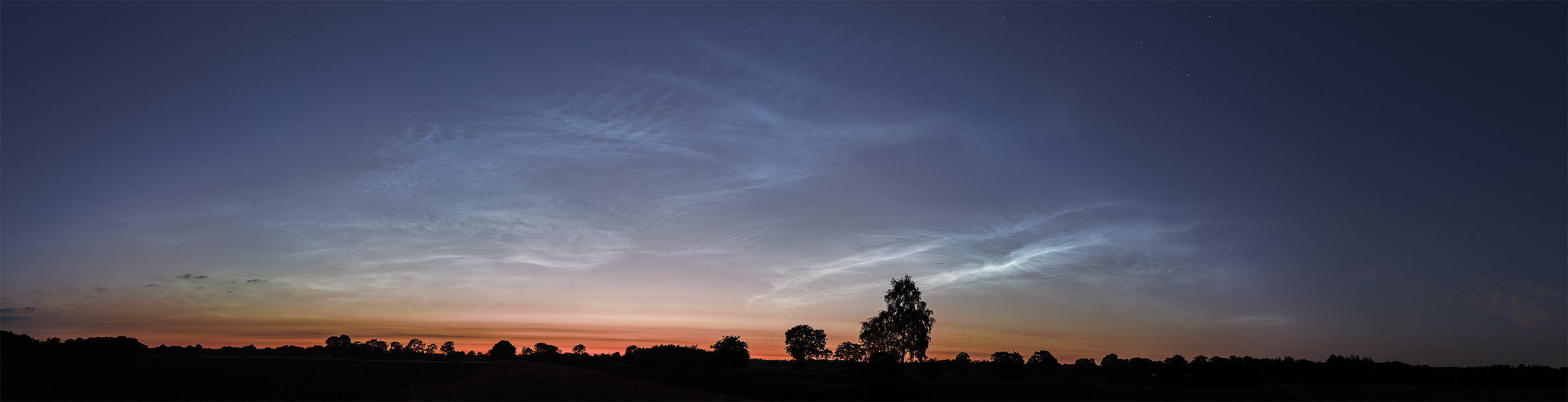 Der Anblick der NLCs wandelte sich schnell, die hochstehenden Strukturen vom Typ IIIa blieben dabei recht lange sichtbar. Dennoch wechselte ich auf ein 50mm-Objektiv, um ein detaillierteres Panorama des Horizonts anzufertigen: