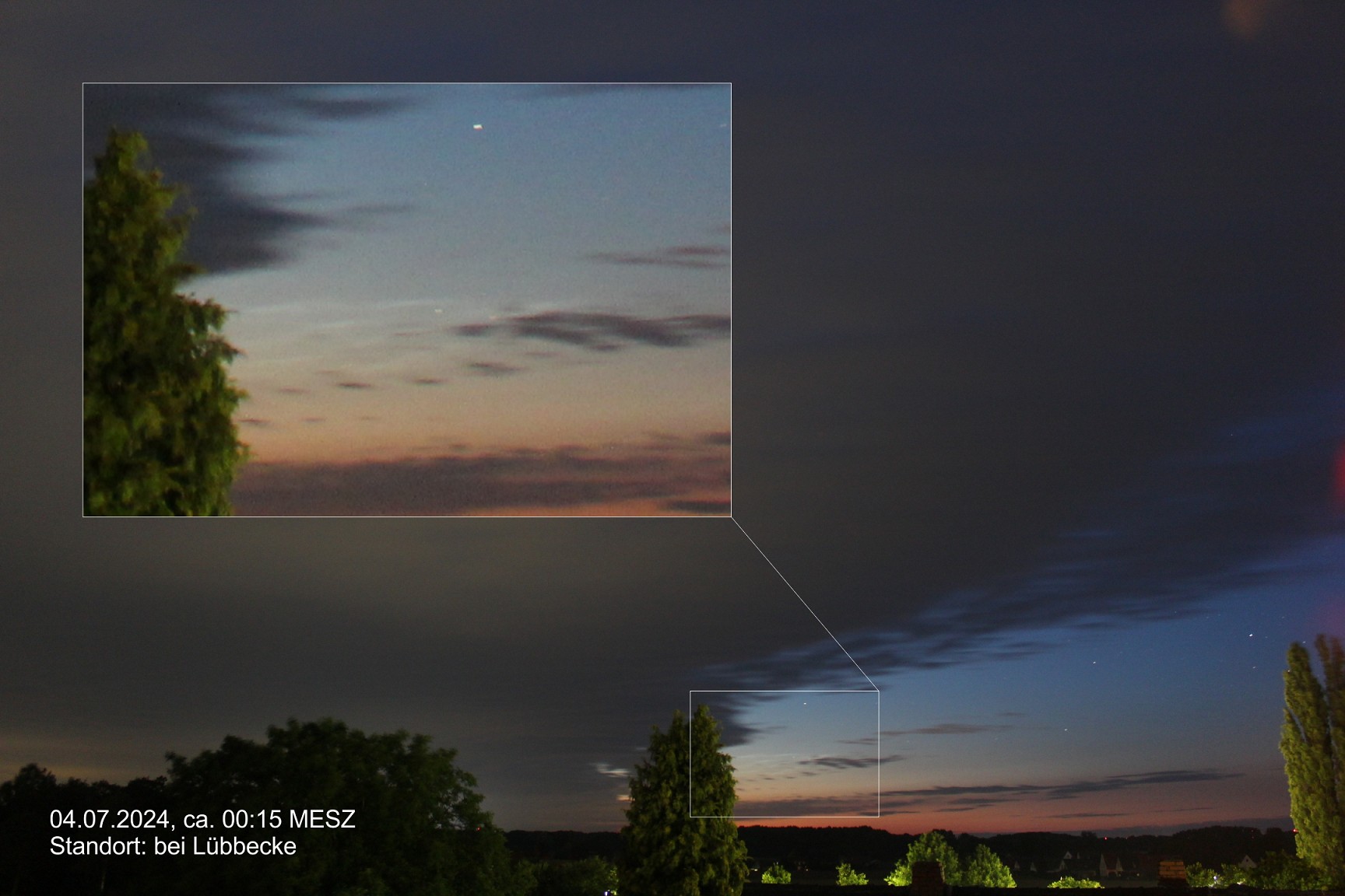 Hinweis: Dokumentation via Netzwerk-Dachkamera; Ab 00:18 MESZ wurden die horizontnahen NLCs von Wolken verdeckt