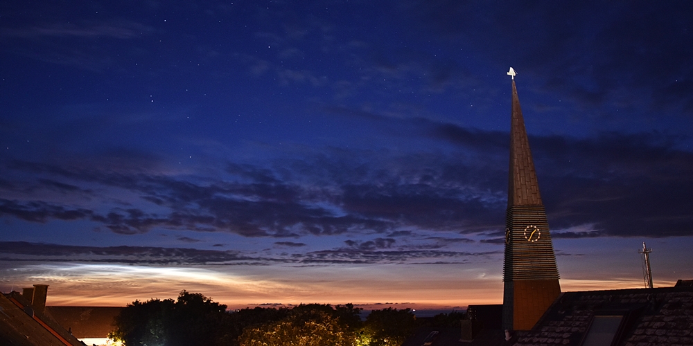 Im Norden waren nach 23:30 MESZ sichtbar. Ich habe nicht durchgängig beobachtet, jedoch waren dann immer NLC sichtbar. Seit einer halben Stunde werden sie im NNW deutlich heller, Höhe ca. 3° (links/rechts ist wegen Bebauung nicht einsehbar). Jetzt ziehen von der Nordsee die vorhergesagten Wolken rein und nur unterhalb vom Polarstern ist der Himmel noch frei. Deshalb bleibt es bei einem Motivationsfoto von 23:11.