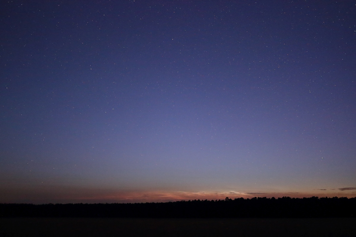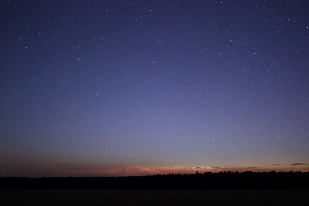 Noch vor Ankunft am Beobachtungsort, wurde ich um kurz nach 22:30 Uhr (MESZ) von den NLCs "überholt" und schließlich auch gestoppt. Bei einem Sonnenstand von ca. -6 Grad, waren die Leuchtenden Nachtwolken nahezu am gesamten Himmel zu beobachten: