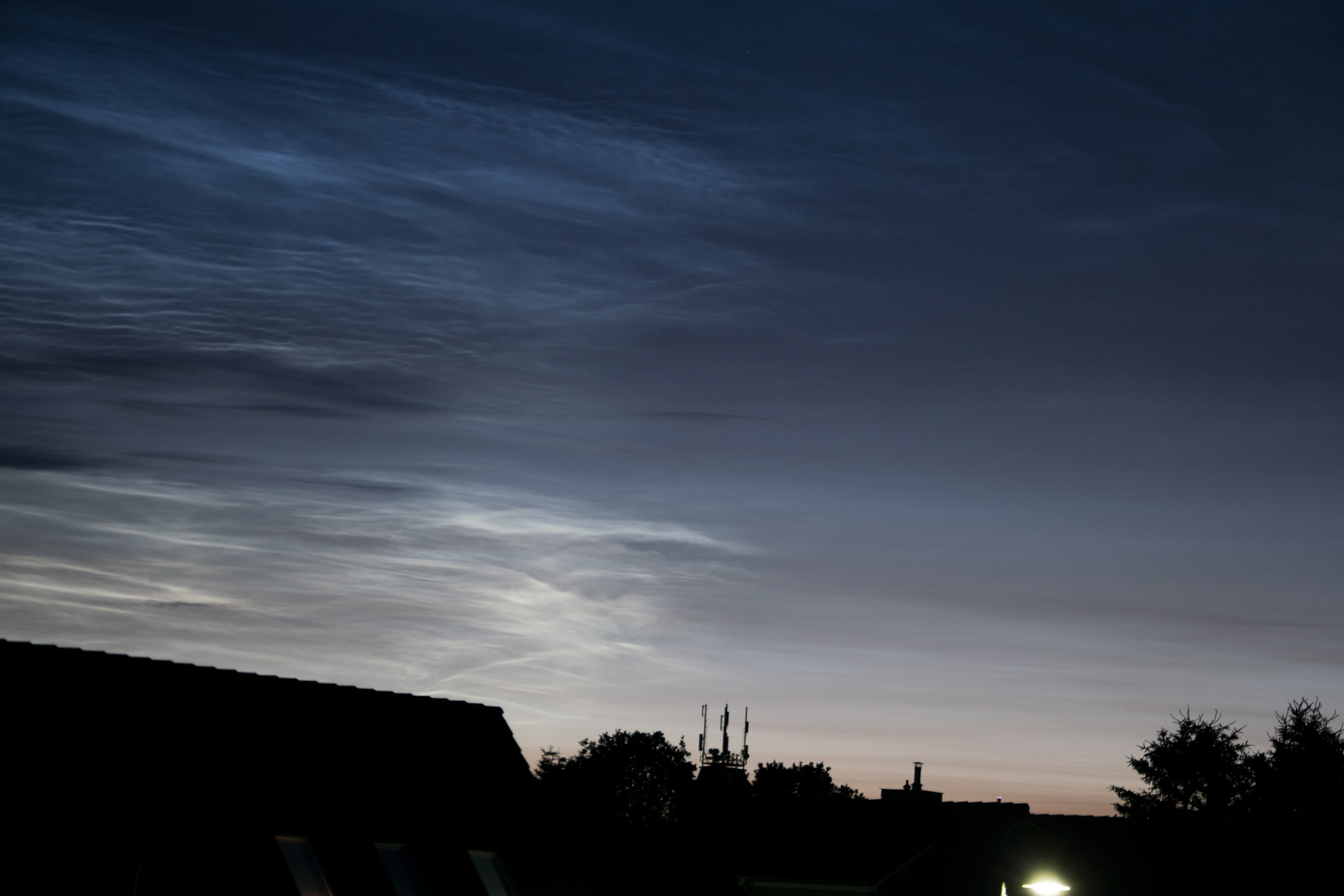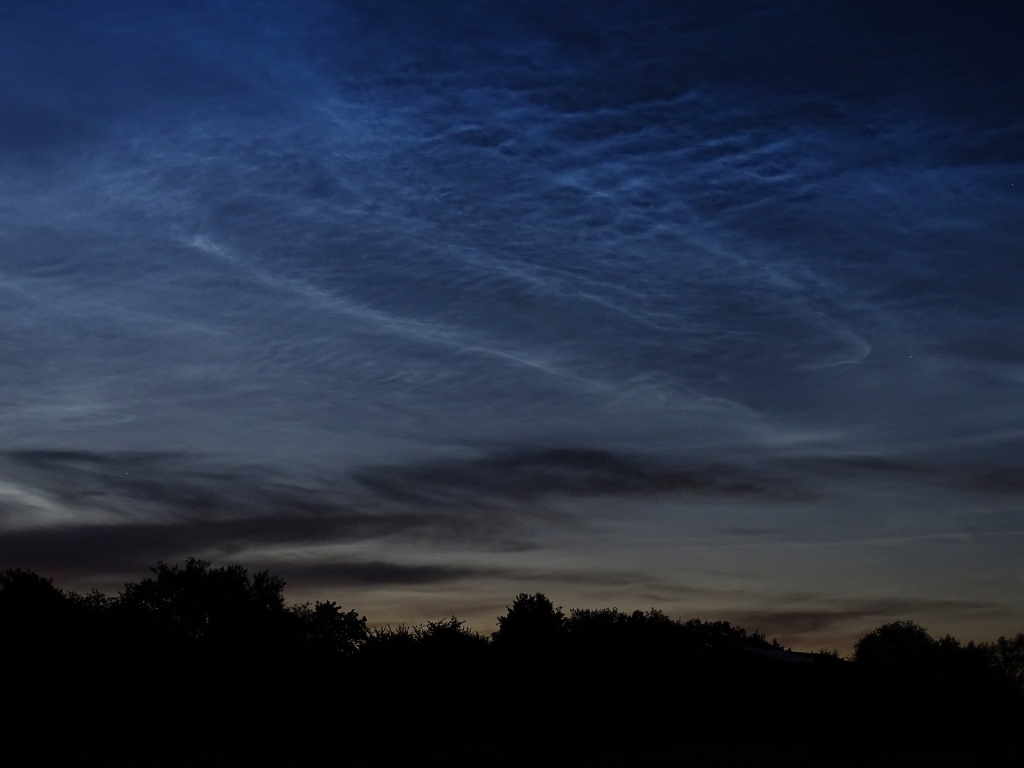Bei meinem Spaziergang in die Abenddämmerung waren die sehr hellen NLCs schon sehr zeitig zu erkennen. Ich war erstaunt, dass die so weit im Westen zu sehen waren. Bereits 22:30 MESZ hoben die sich deutlich vor dem noch recht hellen Himmel ab. Davon habe ich nur ein paar Handyfotos.