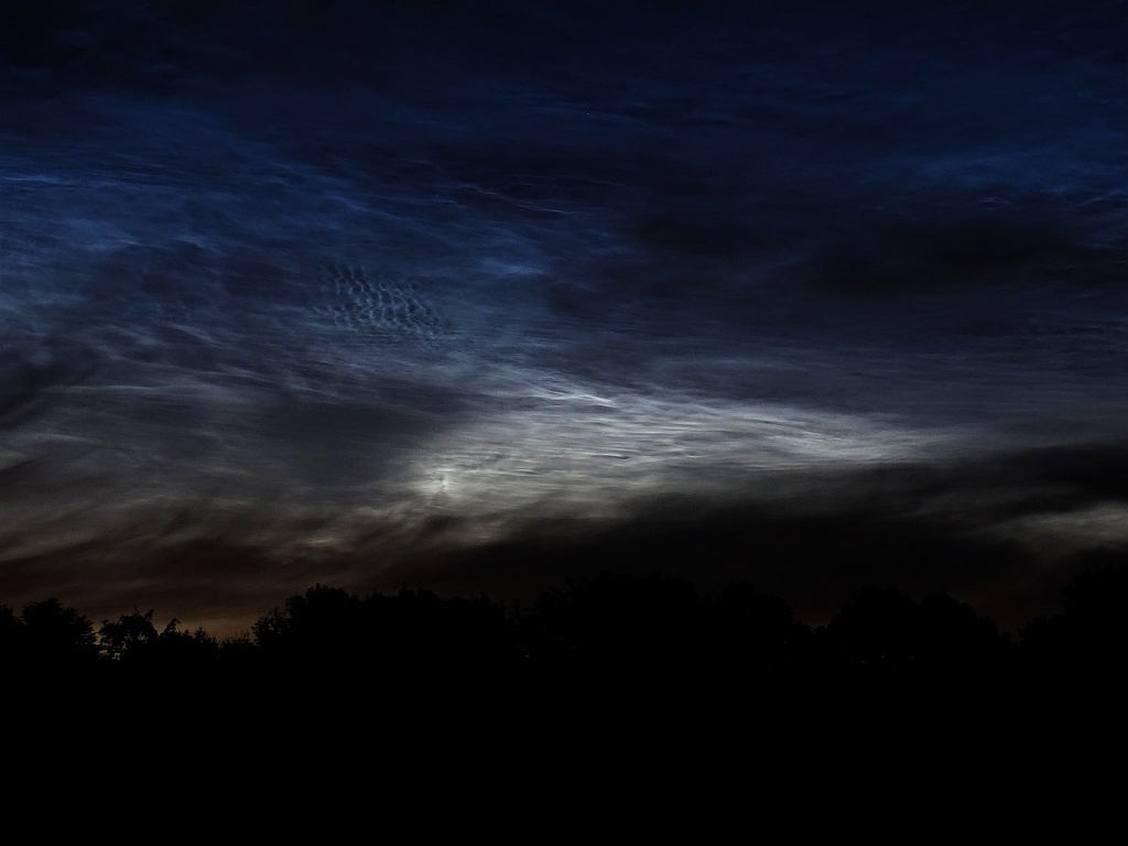 Es war die zweite NLC-Erscheinung (die erste in diesem Jahr), die ich hier von Heidelberg aus beobachten konnte. Leider war ich an diesem Abend nicht in HD; auf der Rückfahrt nach Sinsheim von einer Theateraufführung konnte ich vom Bus (!) aus die NLC gut sehen. Sie waren so eindrucksvoll hell, dass ich sie sogar mit dem Mobilgerät aufnehmen konnte. Auffällig waren die erkennbaren Strukturen; ebenso die Tatsache, dass der Himmel jenseits der NLC äußerst dunkel erschien; nur nach N war er noch auffällig dämmerig hell. Ich kenne mich mit NLC-Helligkeiten nicht aus, aber sie schienen mir außergewöhnlich hell zu sein. Vor allem auf dem Parkplatz in Sinsheim, wo sie um kurz nach 23:00 MESZ schätzungsweise noch 10° hoch reichten, war ein sehr helles Feld zu sehen. Selbst das Zoom-Bild zeigt da noch feine Strukturen!