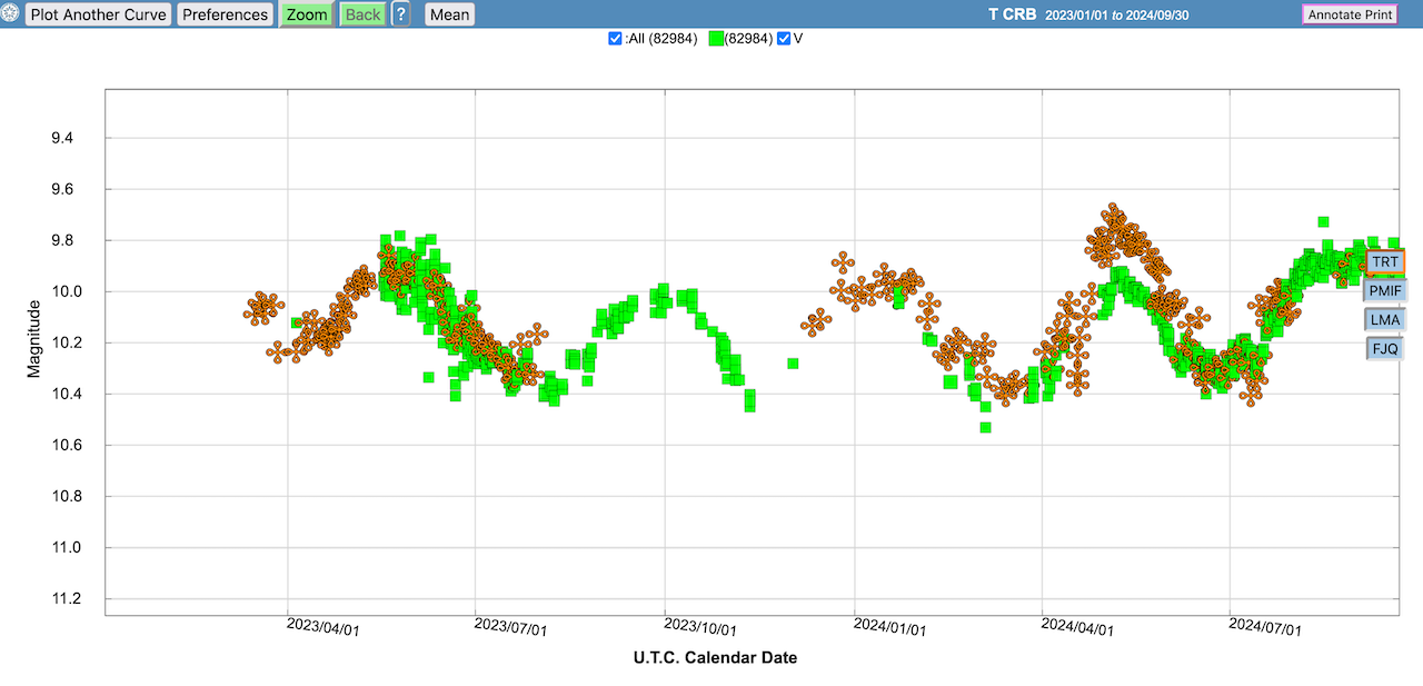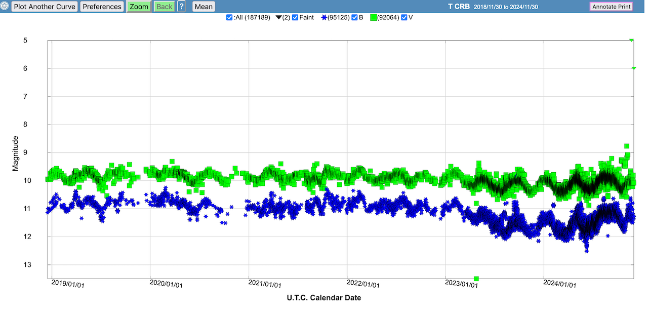 Noch ist der Stern ruhig; und mann kann die Entwicklung hier verfolgen: https://www.aavso.org/LCGv2/. In "Star Name" schlicht "T CrB" eingeben (die grünen Rechtecke zeigen die V mag = visuelle Helligkeit an). Da habe ich gerade gesehen, dass sich der Trend nicht fortgesetzt hat, sondern der Stern vielmehr wieder in seiner normalen Helligkeit in etwa 110 Tagen sehr schön pulsiert. Dennoch lohnt es sich, in jeder klaren Nacht mal in den Sternenhimmel zu gucken...