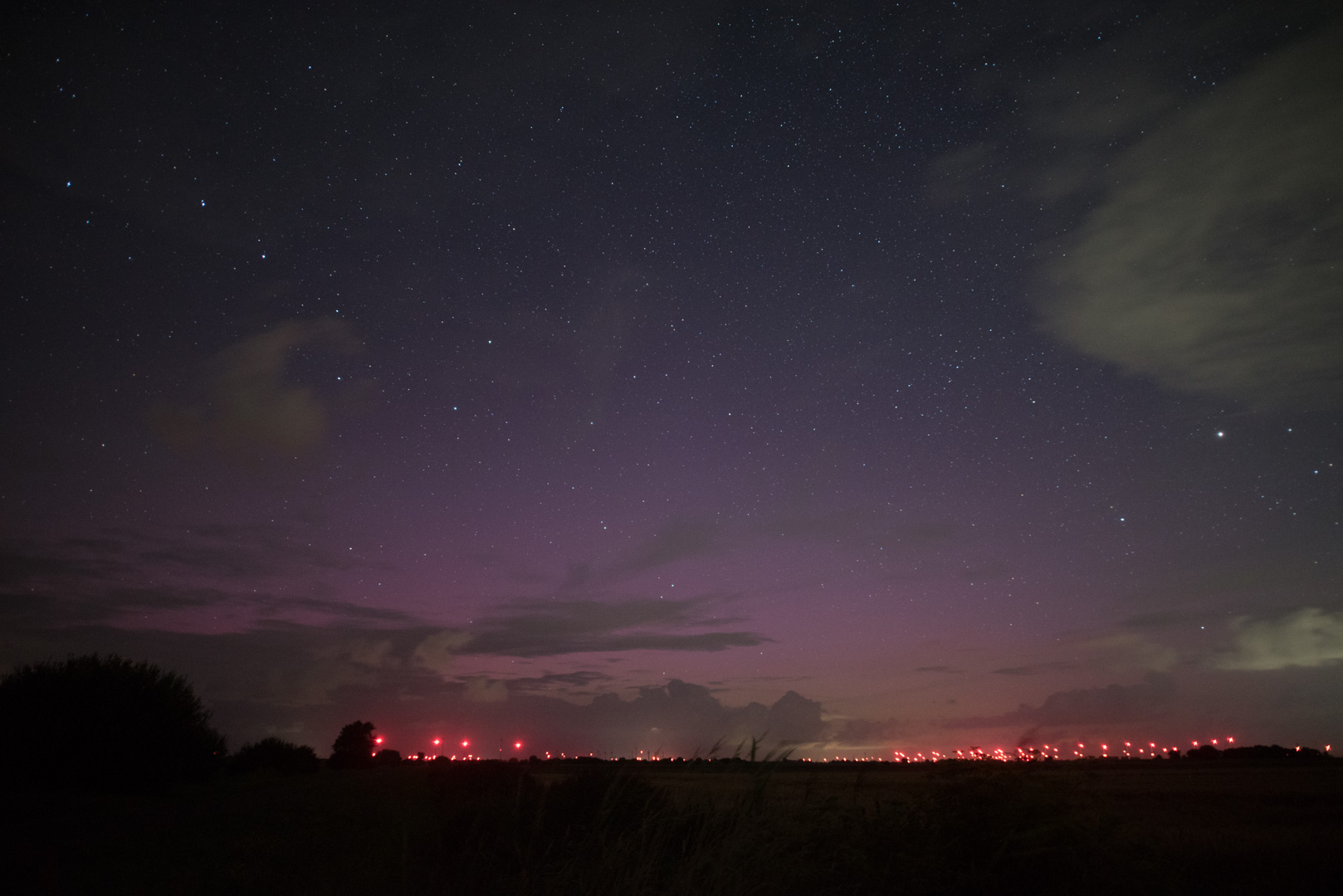 da ich am Abend uneins war, ob ich bei den Werten rausfahren sollte, verpasste ich den Substorm mit den Strahlen. Letzten Endes bin ich dann doch noch aus Hamburg, wo ich im Moment bin, rausgefahren und habe einen Platz auf einen Feldweg bei Langeln nördlich von Hamburg gefunden. Dort konnte ich von Beginn an doch sehr deutlich Polarlicht fotografisch festhalten: Es handelte sich überwiegend um rot-violettes Glimmen. Wenig später wurden dann aus Nordwesten die Wolken immer dichter und ich brach die Beobachtung ab.