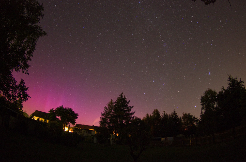 Im Burgkunstadt gab es auch Polarlicht. Eigentlich bin ich wegen der Perseiden mal rausgefahren um zu schauen was so los ist. Ab 23 Uhr war es durchgehend auf dem Display leicht rötlich am Horizont. Hab dann weiter nach den Perseiden ausschau gehalten. Irgendwann hab ich dann mal wieder in Richtung Nordwesten fotografiert und prompt ging es gegen 01:05 MESZ nach ein paar Fotos ohne Polarlicht auch gleich los mit schwachen Beamern. Diese wurden schnell heller und man konnte sie als weiße Strahlen eindeutig gut erkennen. Im weiteren Verlauf sind sie dann weiter nach Norden gewandert und haben sich immer mehr abgeschwächt. Bis 02:30 war weiter fotografisches Polarlicht zu sehen. Danach hab ich abgebaut und bin nach Hause.