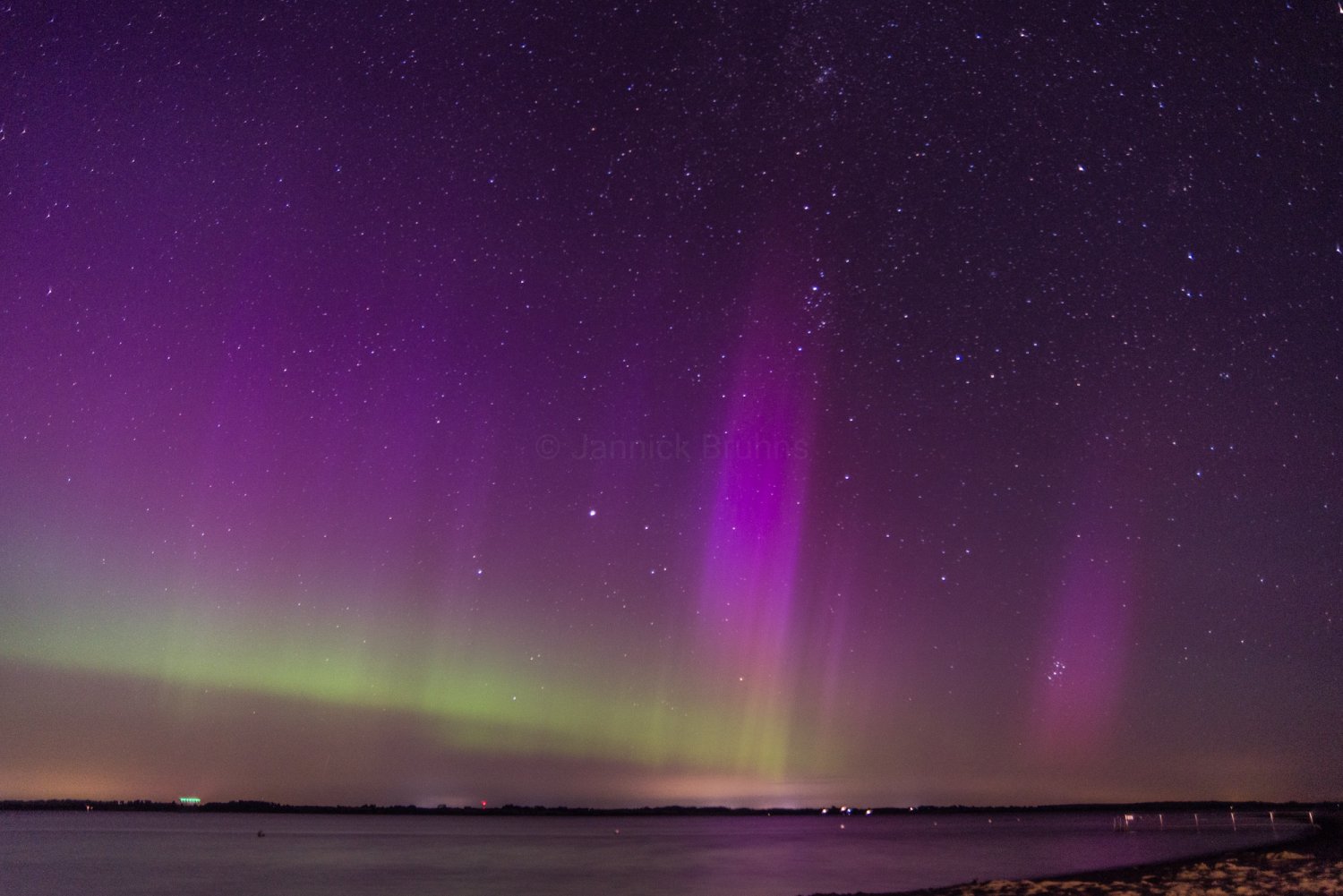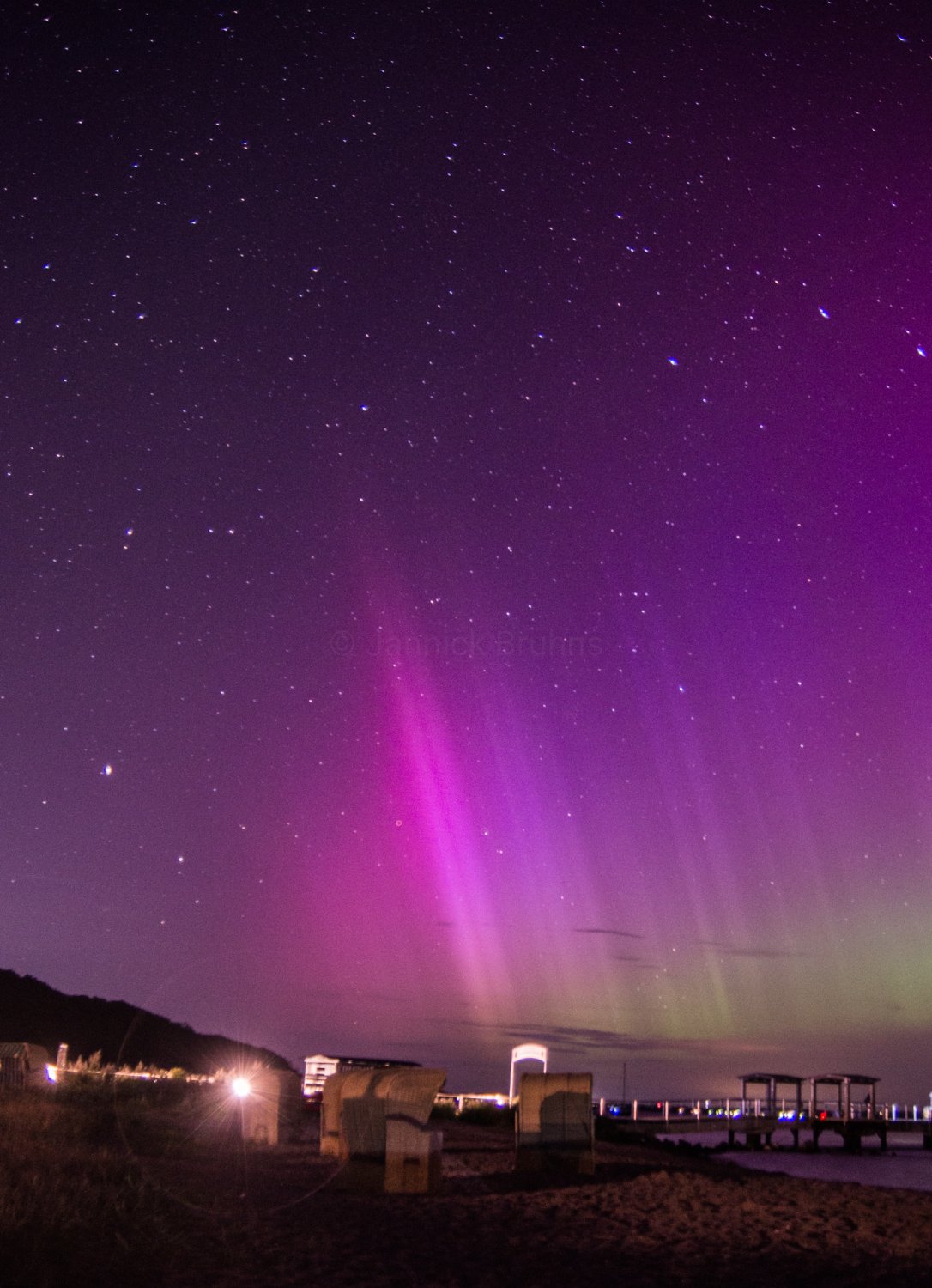 Rügen Arkona Nordstrand. Hatte schon garnicht mehr damit gerechnet aber um 22:30 auf der Arkona Webkam deutliches Polarlicht gesehen. Bin dann überhastet zum Nordstrand. Schon am Parkplatz (ca 23:00) erschien mir der Himmel Violett zu zeigen. Dann volle Sicht, Beamer bis 40grad hoch grün und violett erahnbar. Bis ca 23:30 verschwanden dann die Beamer, diffuser Polarlichtbogen. um ca 0:00 dann wieder aufflammende Beamer. Wunderschön!