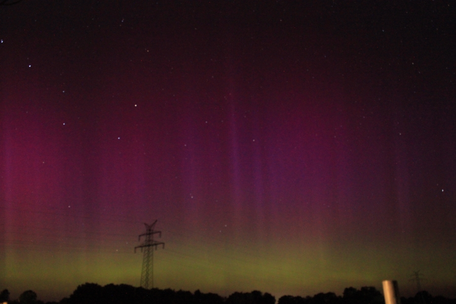 Das Polarlicht war hier in Kaltenkirchen (53.5°N) lange in Form weißlicher vertikaler Streifen mit etwas hellerem Leuchten am Boden erkennbar. (Die rote Farbe war wenn dann nur mit Fantasie und nur im Maximum zu erkennen.)