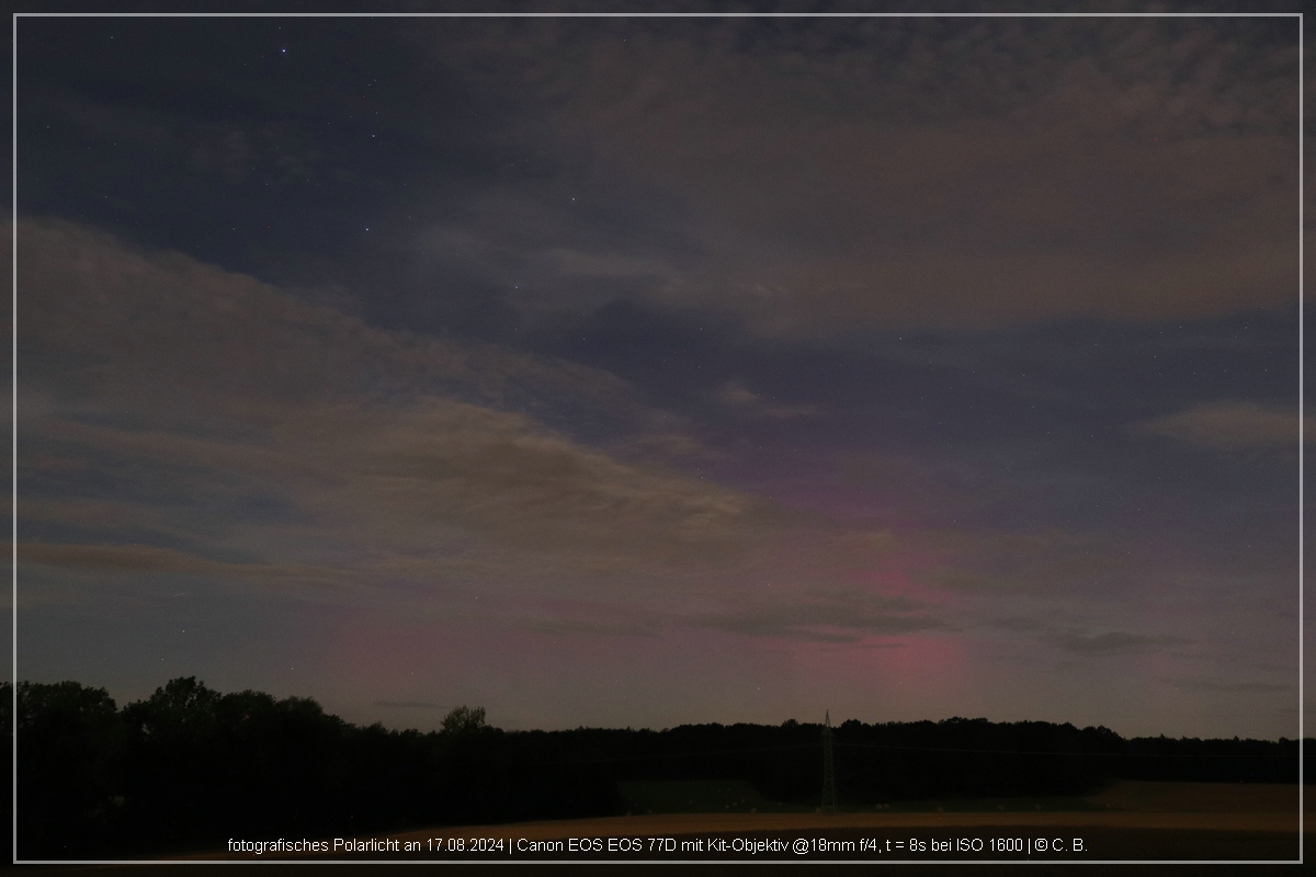 durch die Wolkenlücken hier in Mainfranken nördlich von Würzburg (49.9 Nord) konnte ich um 23:00 Uhr MESZ violettes Polarlicht fotografisch nachweisen.