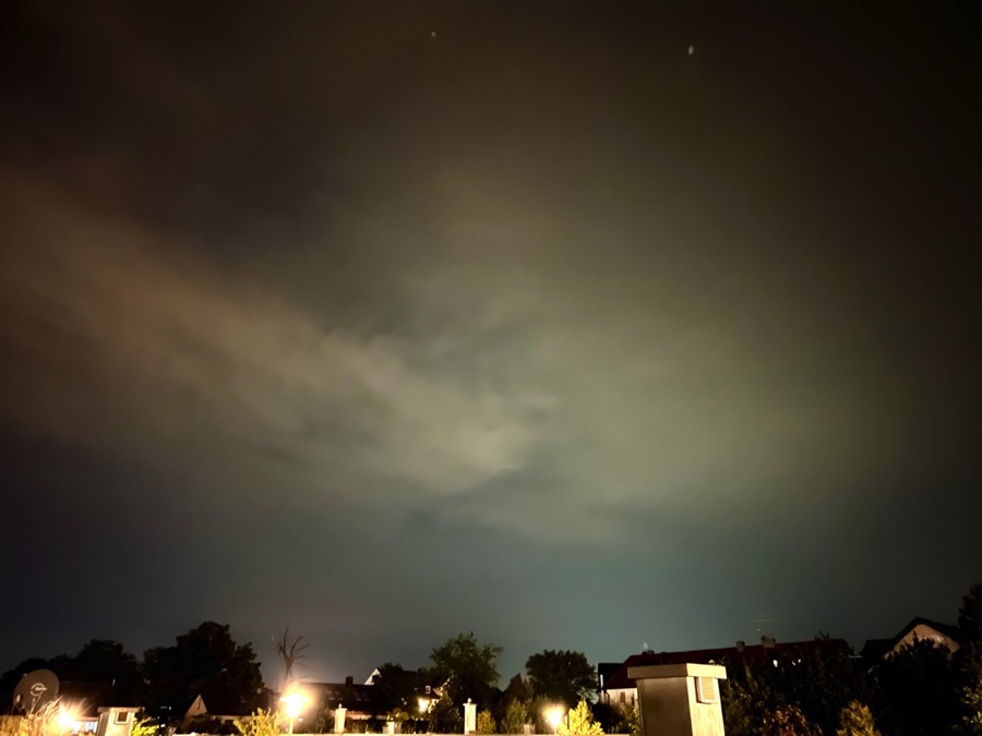 Hier in Südhessen waren zumindest die Polarlichter von der Nacht vom 12. auf den 13.08 durchaus gut bis sehr gut im Nordhorizont in den Handyfotos sichtbar. Mein iphone produziert mir der normalen Linse (1x) bei 10 Sekunden Belichtungszeit die besten Ergebnisse. Es hilft dabei direkte Lichtquellen mit Bäumen oder anderen Gegenständen wegzublocken, damit das Bild nicht so viele Helligkeitsunterschiede hat und die Lichtreflexe in der Handylinse vermieden werden.