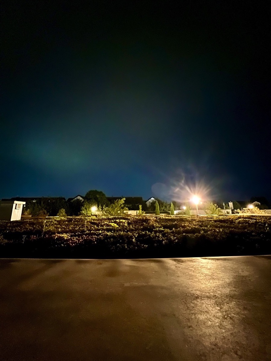 Du hast zu viele helle Laternen rings herum. Ich wage vorsichtig zu bezweifeln, dass du da Polarlicht mit dem Auge wahrnehmen kannst (Außer es ist so heftig wie am 10./11.05.24).