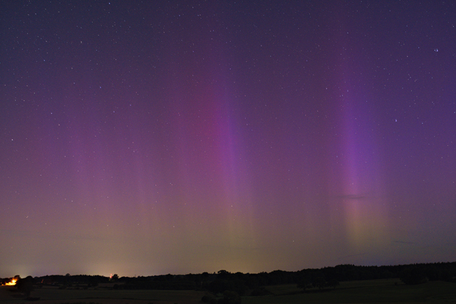 Kommentar: Rot-violettes Polarlicht mit diffusen Flächen und deutlich visuellen Strahlen. Zu Beginn der Nacht auffälliges Airglow.
