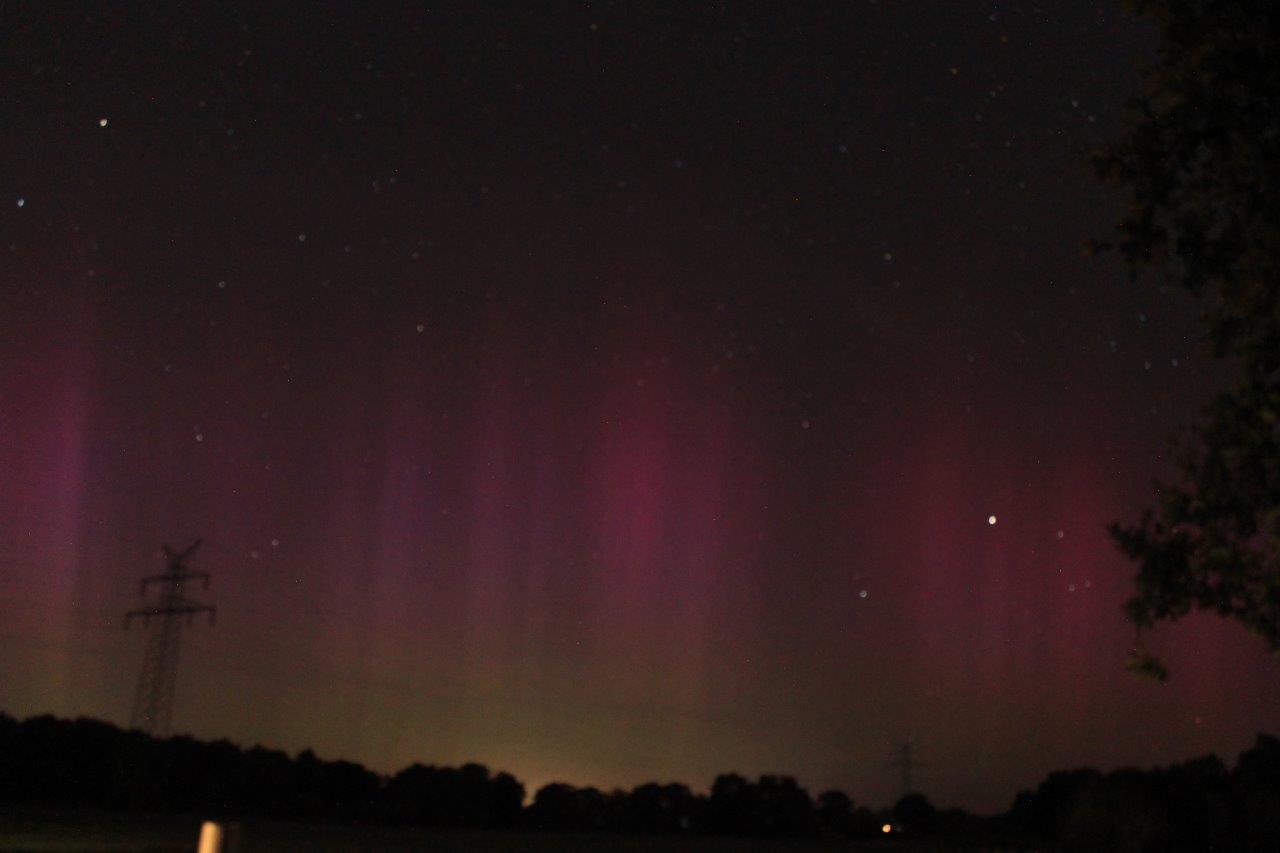 Habe eben in Kaltenkirchen (53°50′N 9°57′E) zeitweise sogar mit bloßem Auge deutlich rötliches Polarlicht sehen können.